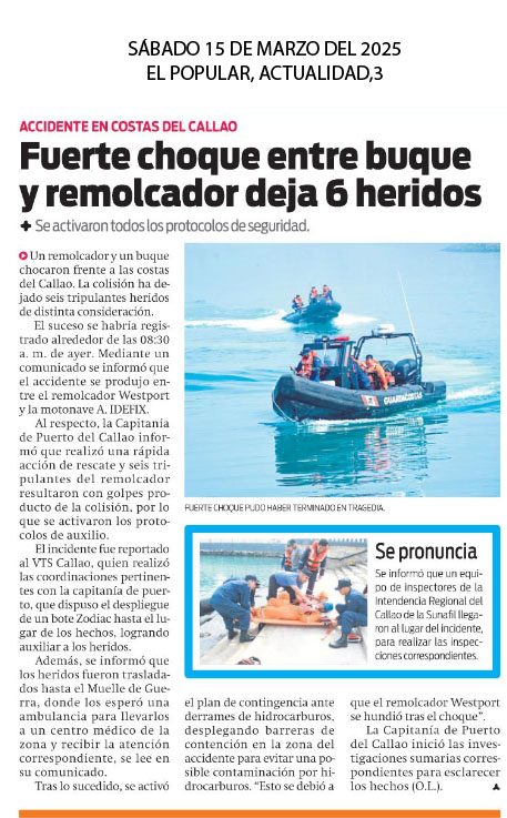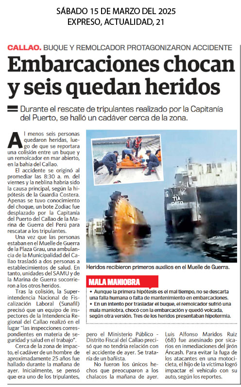 Una colisión entre un buque y un remolcador en la Bahía del Callao dejó seis trabajadores heridos. El accidente sucedió aproximadamente a las 8:30 horas de ayer. Larry Lynch Solis, subgerente de Defensa Civil y Gestión del Riesgo de Desastre de la Municipalidad del Callao, indicó que la comuna acudió a la ayuda de las personas afectadas, apenas tuvieron conocimiento del incidente. De acuerdo con Lynch Solis, la Marina de Guerra del Perú tendrá que investigar las razones del accidente. El Primer Despacho de la Sexta Fiscalía Provincial Penal Corporativa del Callao y el equipo médico-legal efectuaron el levantamiento del cadáver de un hombre que fue hallado en altamar y, posteriormente, trasladado a la Plaza Grau. Según el comunicado de la Marina de Guerra del Perú, se informó que el accidente ocurrió entre el remolcador Westport y la motonave A. IDEFIX.