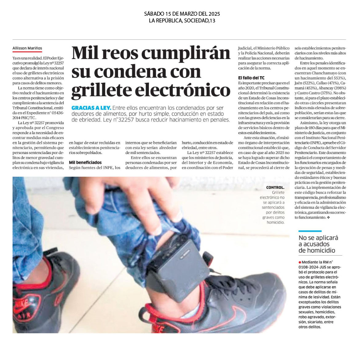 El Congreso de la República formalizó los cambios al Código Penal mediante la publicación de las Leyes 32257 y 32258, destinadas a fortalecer la lucha contra la corrupción y la seguridad ciudadana. En este contexto, el abogado penalista Carlos Caro Coria detalló que la primera norma declara de interés público el uso de grilletes electrónicos para los “delitos menores”. “Se trata de impulsar la despenalización de las cárceles, como una medida para atender, en parte, la sentencia del Tribunal Constitucional que declaró como un ‘estado de cosas inconstitucional’ el ‘permanente y crítico hacinamiento de los establecimientos penitenciarios y las severas deficiencias en su capacidad de albergue, instalaciones sanitarias, servicios de salud, entre otros servicios básicos, a nivel nacional’”.
