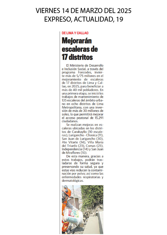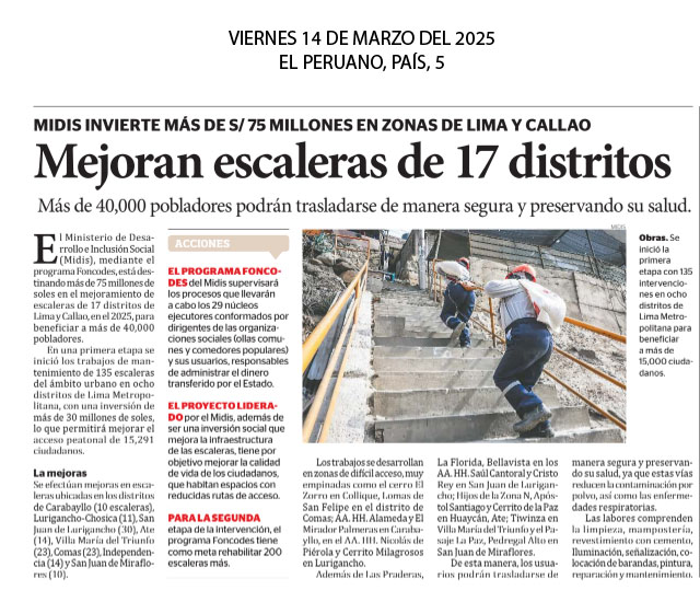 El Ministerio de Desarrollo e Inclusión Social, a través del programa Foncodes, invierte más de S/ 75 millones en el mejoramiento de escaleras de 17 distritos de Lima y Callao, en 2025, para beneficiar a más de 40 mil pobladores.