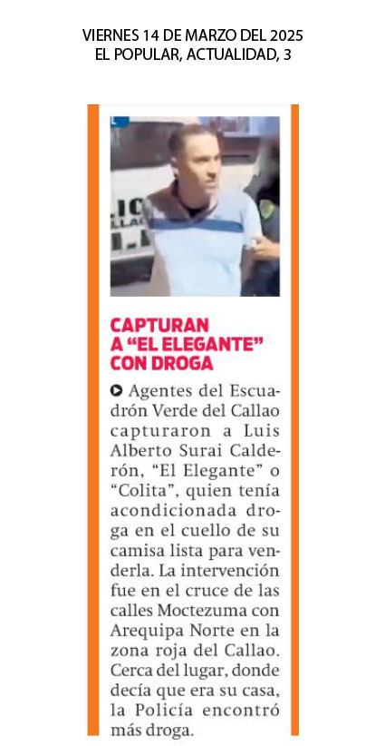 Agentes del Escuadrón Verde del Callao capturaron a Luis Alberto Surai Calderón, "El Elegante" o "Colita", quien tenía acondicionada droga en el cuello de su camisa lista para venderla. La intervención fue en el cruce de las calles Moctezuma con Arequipa Norte en la zona roja del Callao. Cerca del lugar, donde decía que era su casa, la Policía encontró más droga.