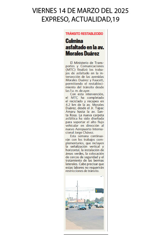 El Ministerio de Transporte y Comunicaciones (MTC) finalizó los trabajos de asfaltado de las avenidas Morales Duárez y Faucett permitiendo el restablecimiento del tránsito desde la 1 a.m. de ayer. Con esta intervención el MTC ha completado el reciclado y recapeo en 4.2 km de la av. Morales Dúarez, desde el Jr. Túpac Amaru jasta la av. Santa Rosa.