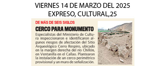 Especialistas del Ministerio de Cultura inspeccionaron e identificaron algunos riesgos de afectación del Sitio Arqueológico Cerro Respiro; ubicado en la margen derecha del río Chillón, en Ventanilla en el Callao. Plantearon la instalación de un cerco perimétrico provisional y un muro de señalización.