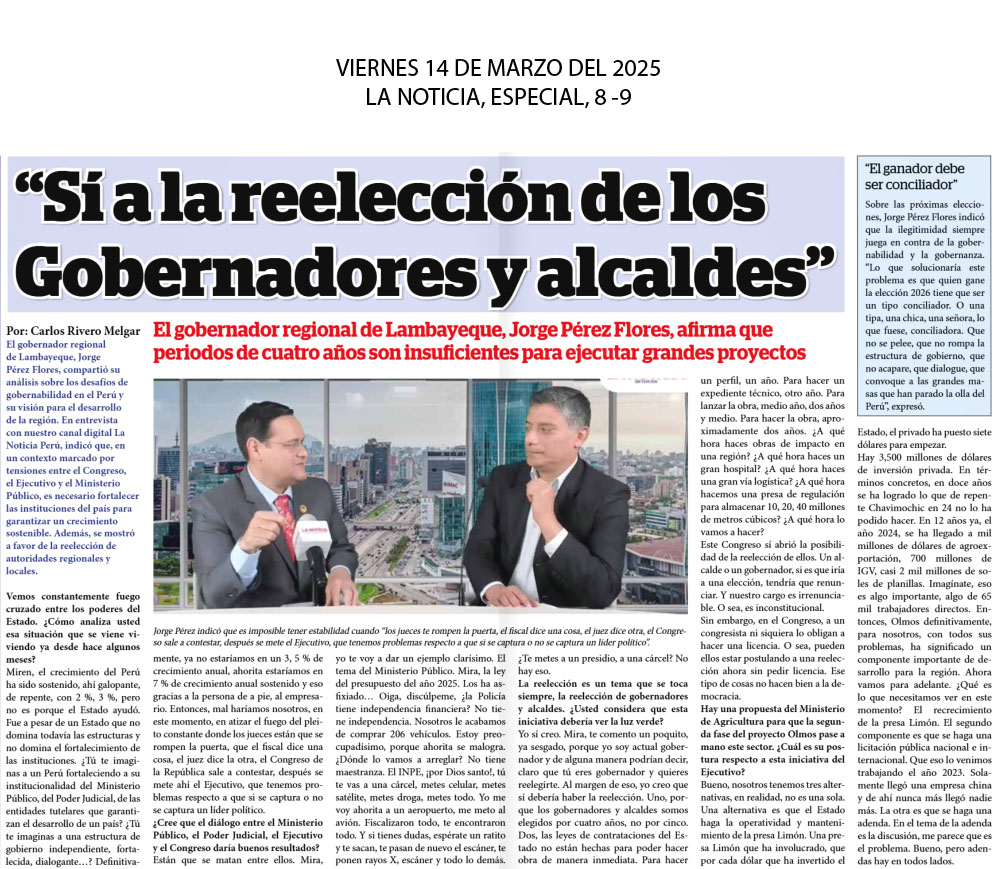 El gobernador regional de Lambayeque, Jorge Pérez Flores, compartió su análisis sobre los desafíos de gobernabilidad en el Perú y su visión para el desarrollo de la región. En entrevista con nuestro canal digital La Noticia Perú, indicó que, en un contexto marcado por tensiones entre el Congreso, el Ejecutivo y el Ministerio Público, es necesario fortalecer las instituciones del país para garantizar un crecimiento sostenible. Además, se mostró a favor de la reelección de autoridades regionales y locales.
