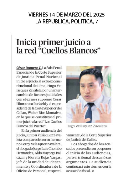 La Sala Penal Especial de la Corte Superior de Justicia Penal Nacional inició el juicio al ex juez constitucional de Lima, Hugo Velásquez Zavaleta por un intercambio de favores judiciales con el ex juez supremo César Hinostroza Pariachi y el expresidente de la Corte Superior del Callao, Walter Ríos Montalvo, en lo que se constituye el primer juicio a la red "Los Cuellos Blancos del Puerto". En la primer audiencia del juicio, junto a Velásquez Zavaleta comparecieron su hermano Percy Velásquez Zavaleta, el abogado Jorge Luis Chombo Hernández, Aldo Mayorga Balcázar y Fiorella Rojas Vargas, jefe de la unidad de Planeamiento y Coordinadora de la Oficina de Personal, respectivamente, de la Corte Superior de Justicia del Callao.
