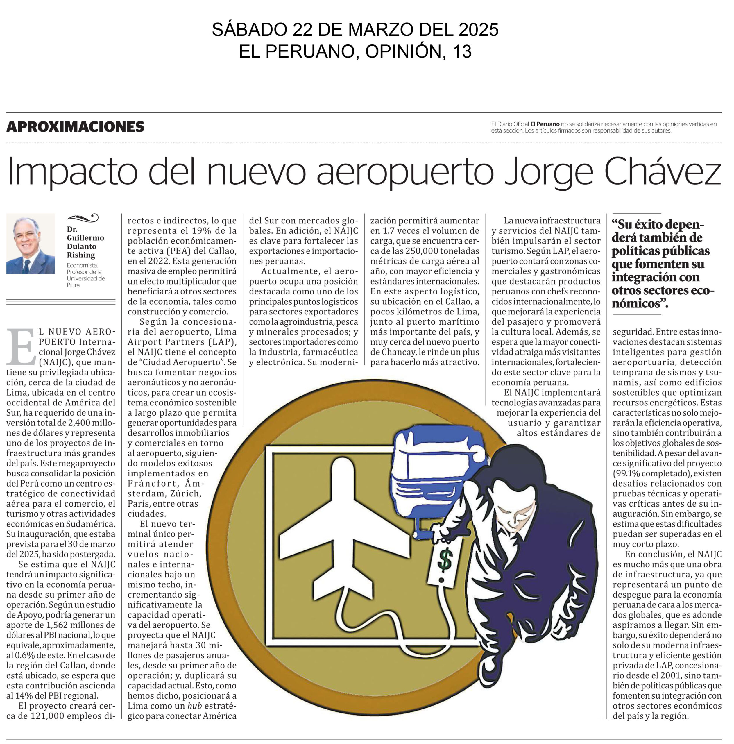 Artículo del Dr. Guillermo Dulanto Rishing, economista y profesor de la Universidad de Piura. “(…) Se estima que el Nuevo Aeropuerto Internacional Jorge Chávez (NAIJC) tendrá un impacto significativo en la economía peruana desde su primer año de operación. Según un estudio de Apoyo, podría generar un aporte de 1,562 millones de dólares al PBI nacional, lo que equivale, aproximadamente, al 0.6% de este. En el caso de la región del Callao, donde está ubicado, se espera que esta contribución ascienda al 14% del PBI regional…”.
