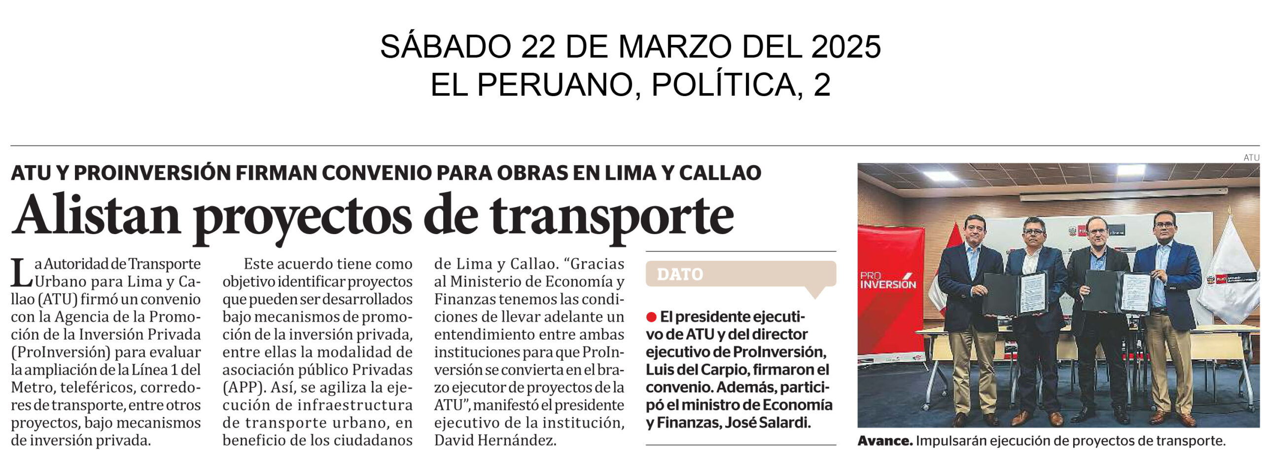 La Autoridad de Transporte Urbano para Lima y Callao (ATU) firmó un convenio con la Agencia de la Promoción de la Inversión Privada (ProInversión) para evaluar la ampliación de la Línea 1 del Metro, teleféricos, corredores de transporte, entre otros proyectos, bajo mecanismos de inversión privada. Este acuerdo tiene como objetivo identificar proyectos que pueden ser desarrollados bajo mecanismos de promoción de la inversión privada, entre ellas la modalidad de asociación público Privadas (APP). Así, se agiliza la ejecución de infraestructura de transporte urbano, en beneficio de los ciudadanos de Lima y Callao.