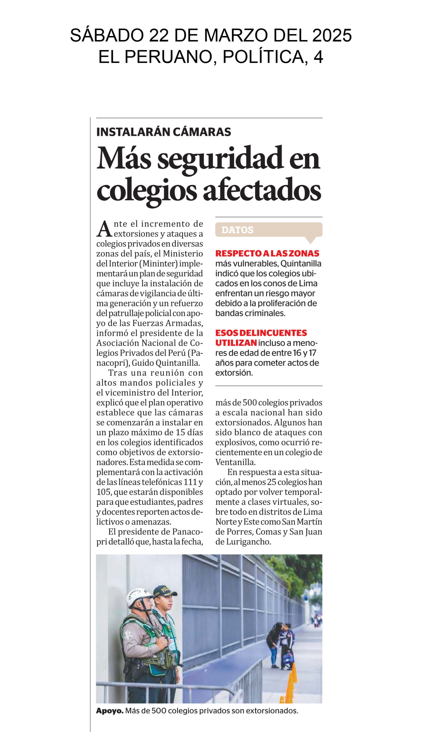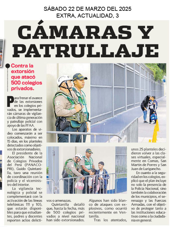 Ante el incremento de extorsiones y ataques a colegios privados en diversas zonas del país, el Ministerio del Interior (Mininter) implementará un plan de seguridad que incluye la instalación de cámaras de vigilancia de última generación y un refuerzo del patrullaje policial con apoyo de las Fuerzas Armadas, informó el presidente de la Asociación Nacional de Colegios Privados del Perú (Panacopri), Guido Quintanilla. El presidente de Panacopri detalló que, hasta la fecha, más de 500 colegios privados a escala nacional han sido extorsionados. Algunos han sido blanco de ataques con explosivos, como ocurrió recientemente en un colegio de Ventanilla. En respuesta a esta situación, al menos 25 colegios han optado por volver temporalmente a clases virtuales, sobre todo en distritos de Lima Norte y Este como San Martín de Porres, Comas y San Juan de Lurigancho.