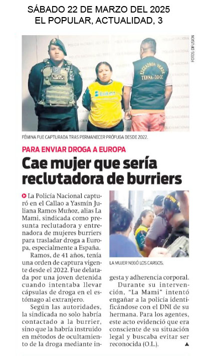 La Policía Nacional capturó en el Callao a Yasmín Juliana Ramos Muñoz, alias la Mami, sindicada como presunta reclutadora y entrenadora de mujeres burriers para trasladar droga a Europa, especialmente a España.