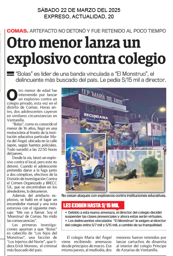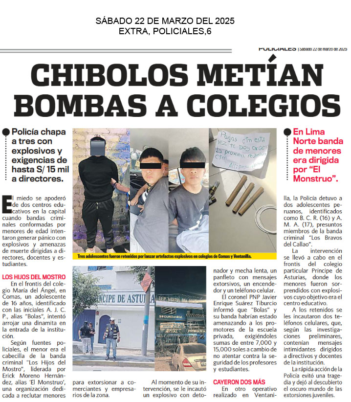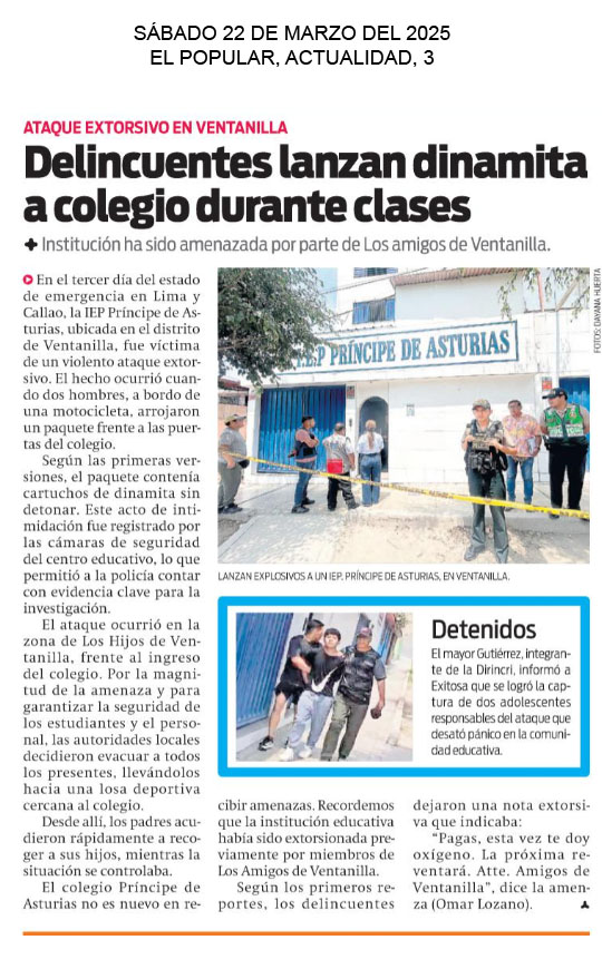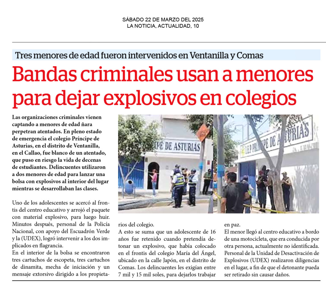 Las organizaciones criminales vienen captando a menores de edad para perpetrar atentados. En pleno estado de emergencia el colegio Príncipe de Asturias, en el distrito de Ventanilla, en el Callao, fue blanco de un atentado, que puso en riesgo la vida de decenas de estudiantes. Delincuentes utilizaron a dos menores de edad para lanzar una bolsa con explosivos al interior del lugar mientras se desarrollaban las clases. Uno de los adolescentes se acercó al frontis del centro educativo y arrojó el paquete con material explosivo, para luego huir. Minutos después, personal de la Policía Nacional, con apoyo del Escuadrón Verde y la (UDEX), logró intervenir a los dos implicados en flagrancia. En el interior de la bolsa se encontraron tres cartuchos de escopeta, tres cartuchos de dinamita, mecha de iniciación y un mensaje extorsivo dirigido a los propietarios del colegio.