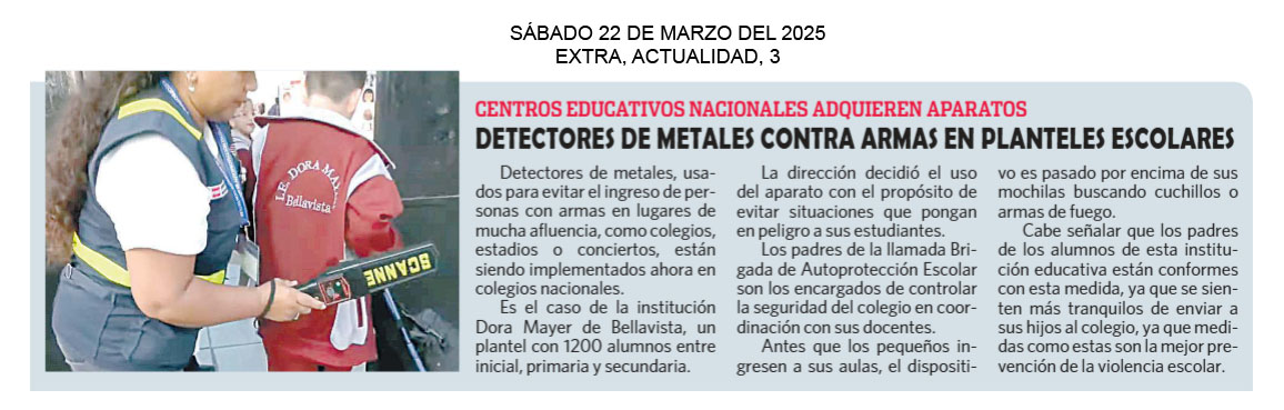 Detectores de metales, usados para evitar el ingreso de personas con armas en lugares de mucha afluencia, como colegios, estadios o conciertos, están siendo implementados ahora en colegios nacionales. Es el caso de la institución Dora Mayer de Bellavista, un plantel con 1200 alumnos entre inicial, primaria y secundaria.
