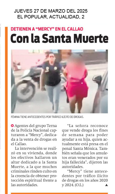 Agentes del grupo Terna de la Policía Nacional capturaron a “Mercy”, dedicada a la venta de drogas en el Callao. La intervención fue en su vivienda, donde los efectivos hallaron un altar dedicado a la Santa Muerte, a la que muchos criminales rinden culto en la creencia de obtener protección espiritual frente a las autoridades.