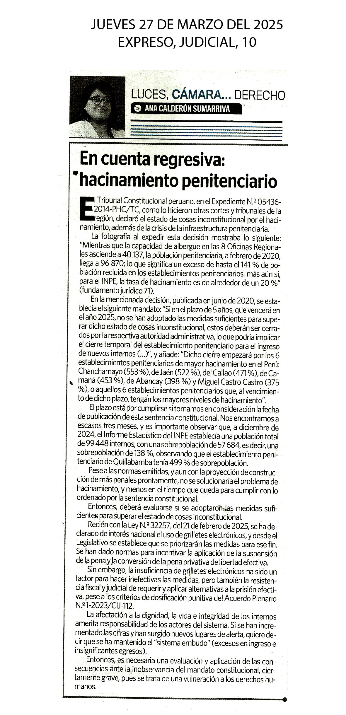 Artículo de Ana Calderón Sumarriva. “El Tribunal Constitucional peruano, en el Expediente N.º 05436-2014-PHC/TC, como lo hicieron otras cortes y tribunales de la región, declaró el estado de cosas inconstitucional por el hacinamiento, además de la crisis de la infraestructura penitenciaria (...) En la mencionada decisión, publicada en junio de 2020, se establecía el siguiente mandato: “Si en el plazo de 5 años, que vencerá en el año 2025, no se han adoptado las medidas suficientes para superar dicho estado de cosas inconstitucional, estos deberán ser cerrados por la respectiva autoridad administrativa, lo que podría implicar el cierre temporal del establecimiento penitenciario para el ingreso de nuevos internos (…)”, y añade: “Dicho cierre empezará por los 6 establecimientos penitenciarios de mayor hacinamiento en el Perú: Chanchamayo (553 %), de Jaén (522 %), del Callao (471 %), de Camaná (453 %), de Abancay (398 %) y Miguel Castro Castro (375 %), o aquellos 6 establecimientos penitenciarios que, al vencimiento de dicho plazo, tengan los mayores niveles de hacinamiento”...".