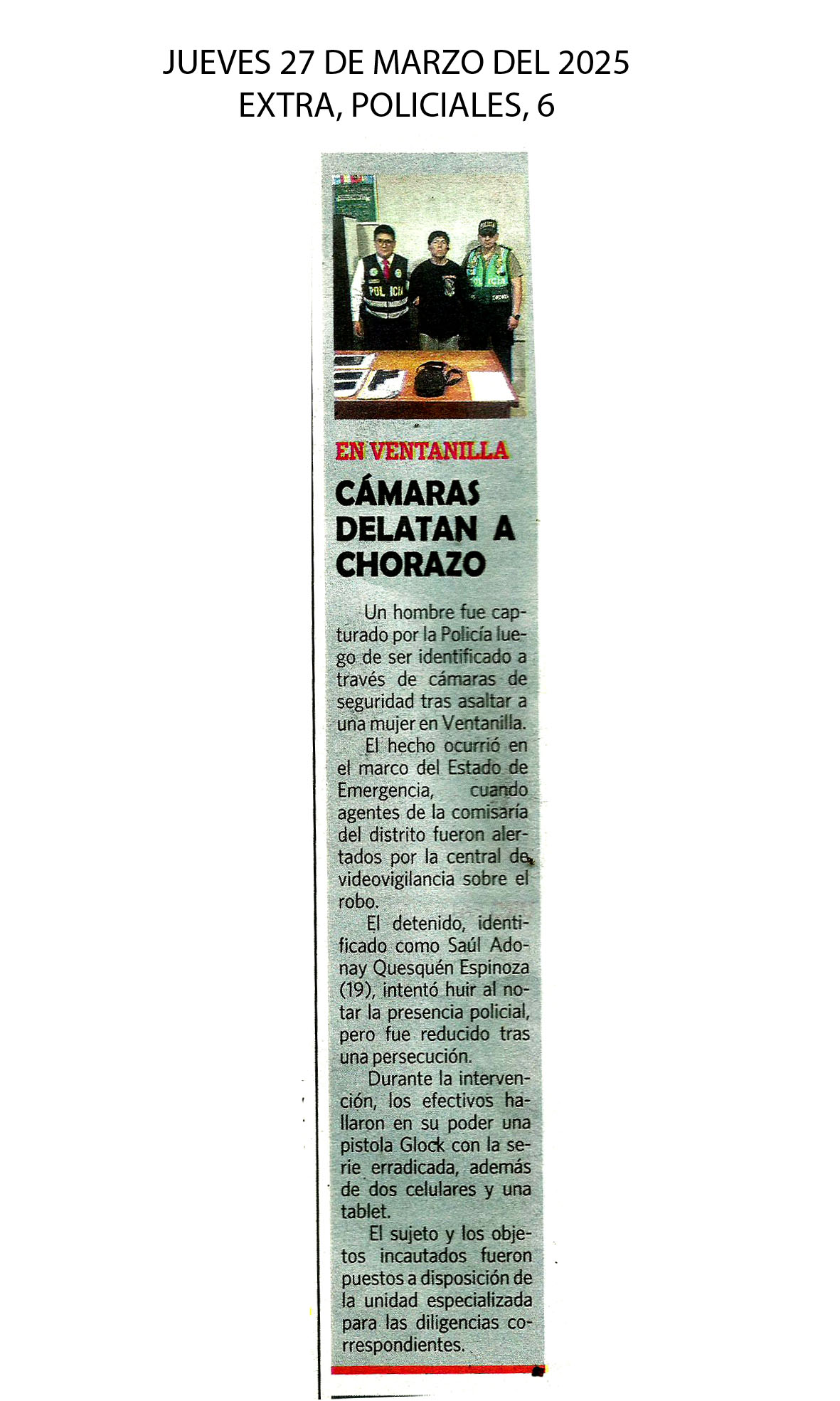Un hombre fue capturado por la Policía luego de ser identificado a través de cámaras de seguridad tras as altar a una mujer en Ventanilla. El detenido, identificado como Saúl Adonay Quesquén Espínoza (19) intent huir al notar la presencia policial pero fue reducido tras una persecución.