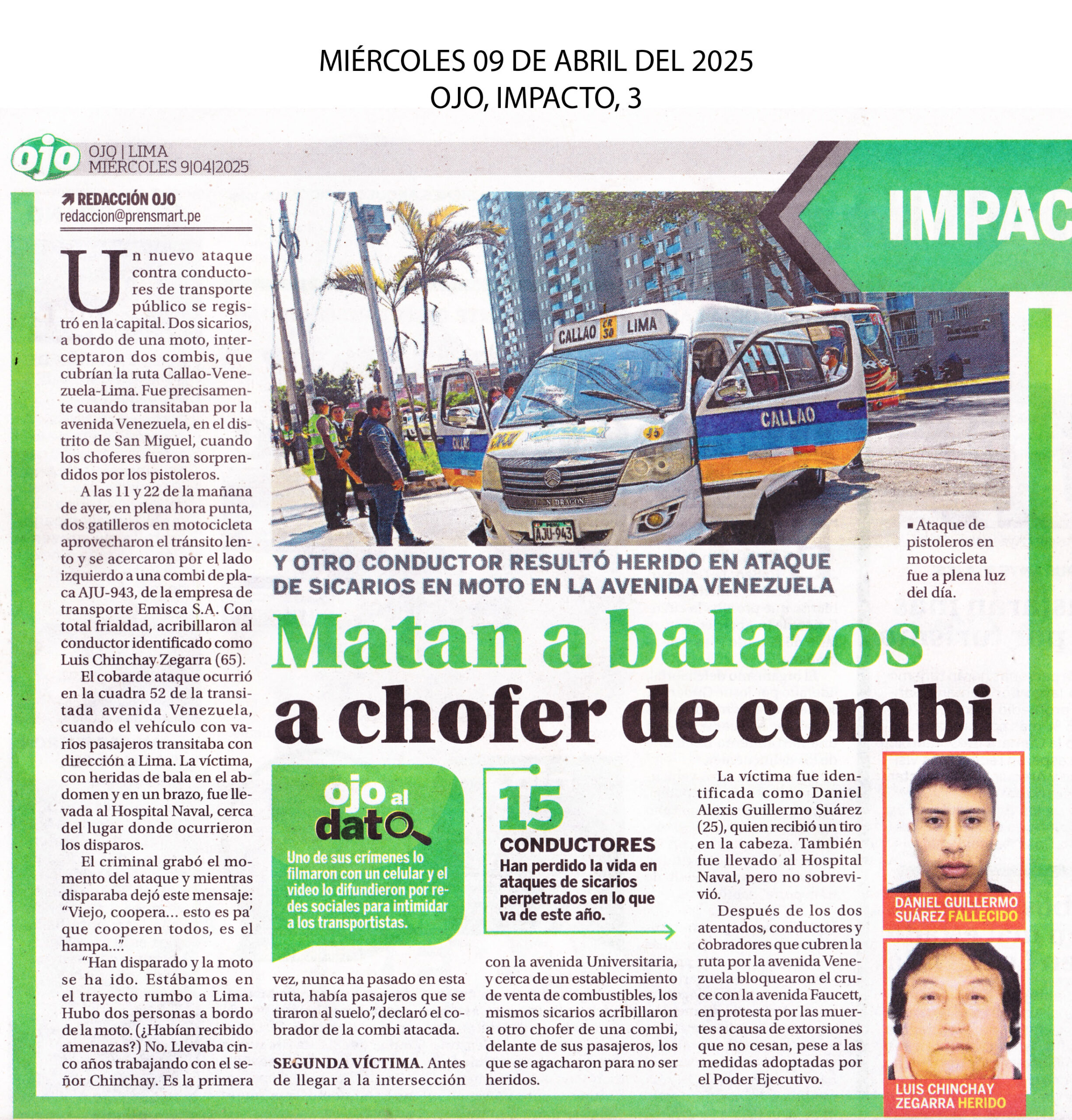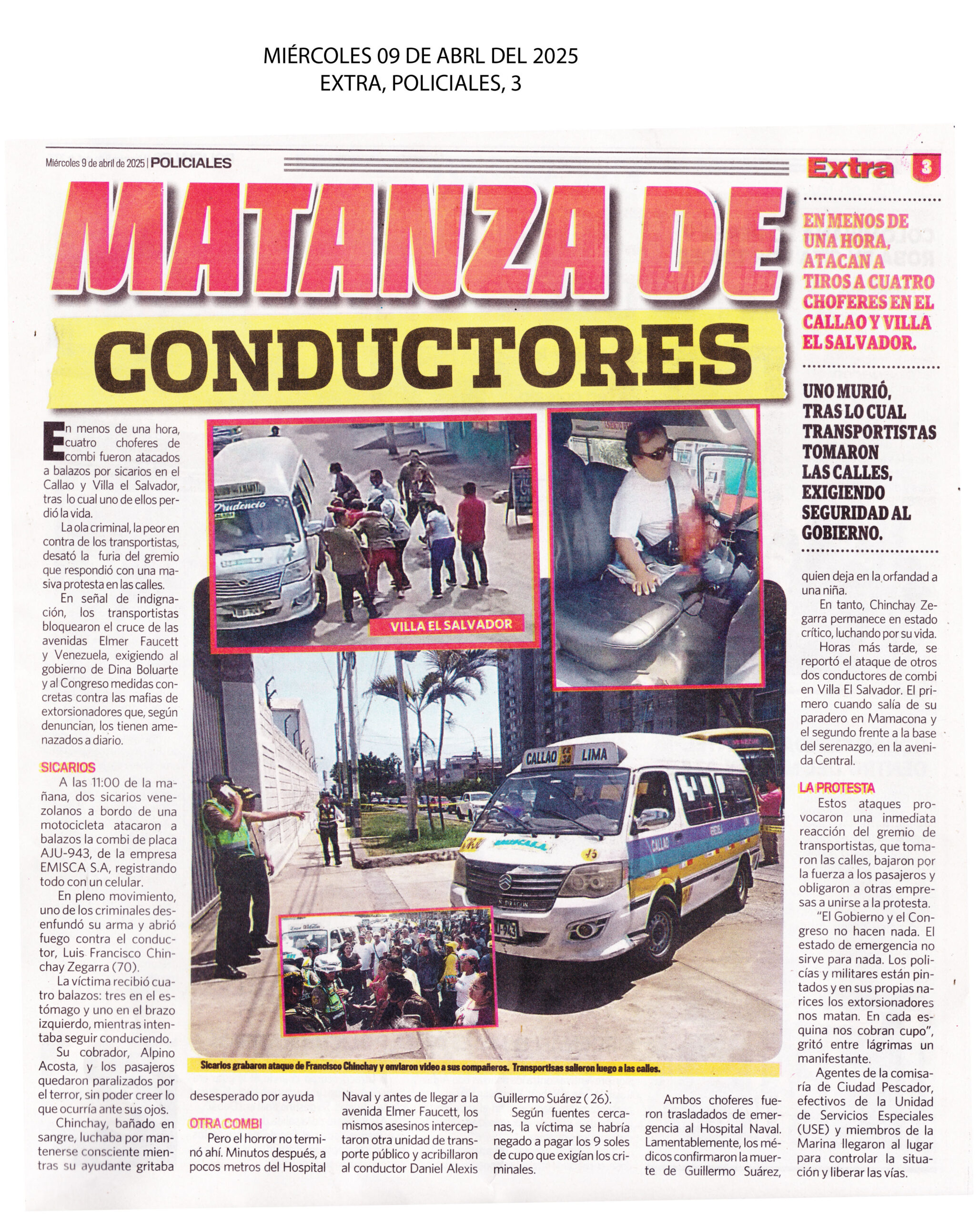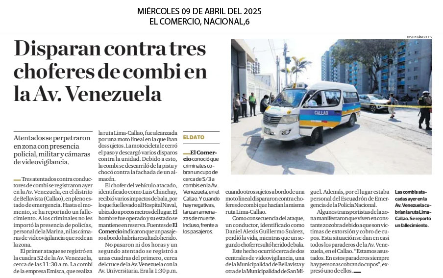 En un nuevo episodio de inseguridad que sacude al país, Daniel Alexis Guillermo Suárez, conductor de una combi, fue asesinado a balazos a solo unas cuadras de la avenida Faucett. El crimen ha desatado la indignación de la ciudadanía, que tomó las calles para exigir justicia y mayor seguridad. El hecho ocurrió por la misma zona donde horas antes hirieron a balazos a otro conductor, se trata de Luis Chinchay de 65 años, el ataque se produjo en la avenida Venezuela a la altura del Hospital Naval, en el Callao.