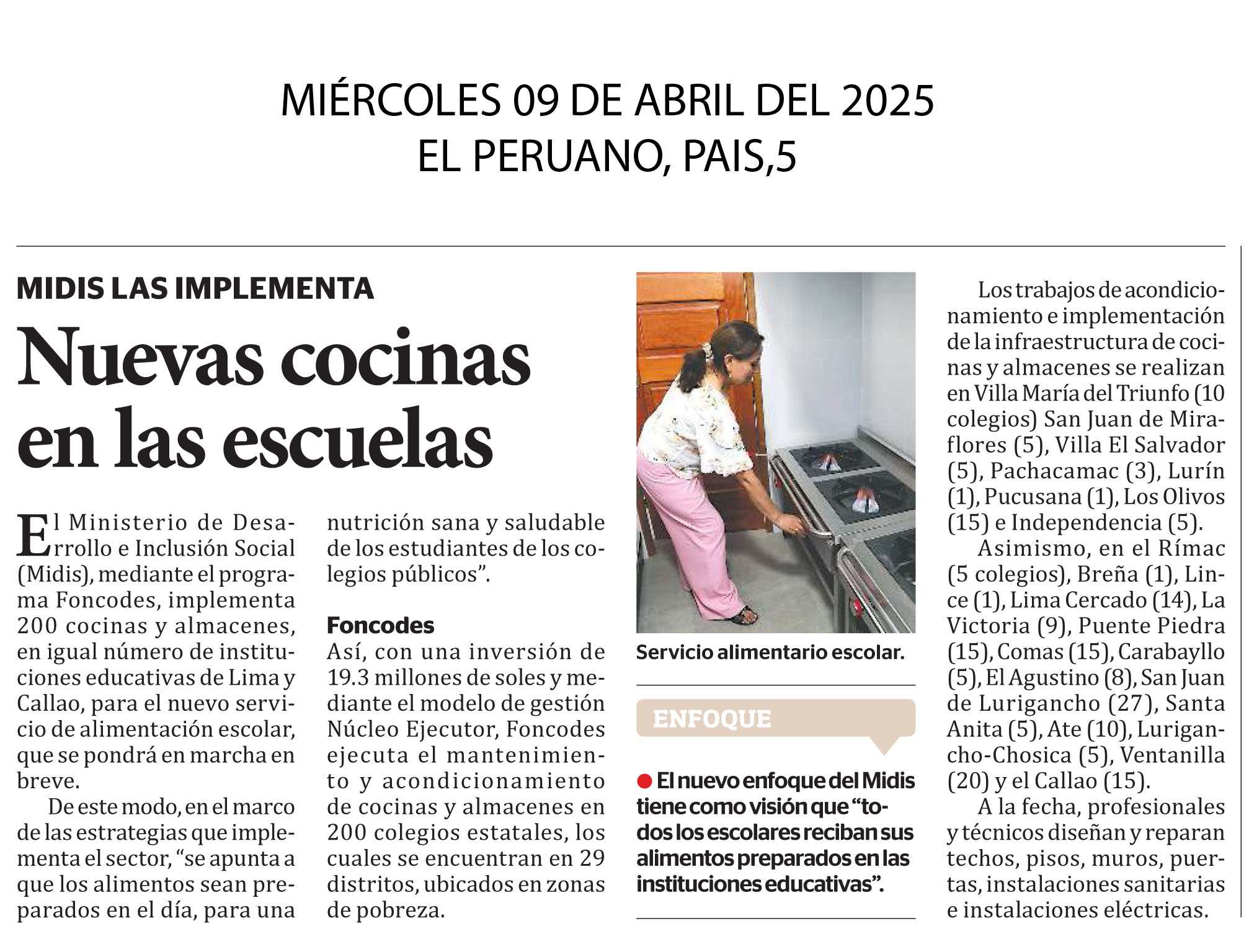 El Ministerio de Desarrollo e Inclusión Social (Midis) mediante el Foncodes, viene implementando 200 cocinas y almacenes, en igual número de instituciones educativas de Lima y Callao, para el nuevo servicio de alimentación escolar, que se pondrá en marcha en breve, en el marco de las estrategias que implementará el sector. El objetivo es que los alimentos sean preparados en el día, a fin de garantizar una nutrición sana y saludable para los estudiantes de los colegios públicos. Los trabajos de mantenimiento, acondicionamiento e implementación de la infraestructura de cocinas y almacenes se realizan entre ellos, en 15 colegios de El Callao.