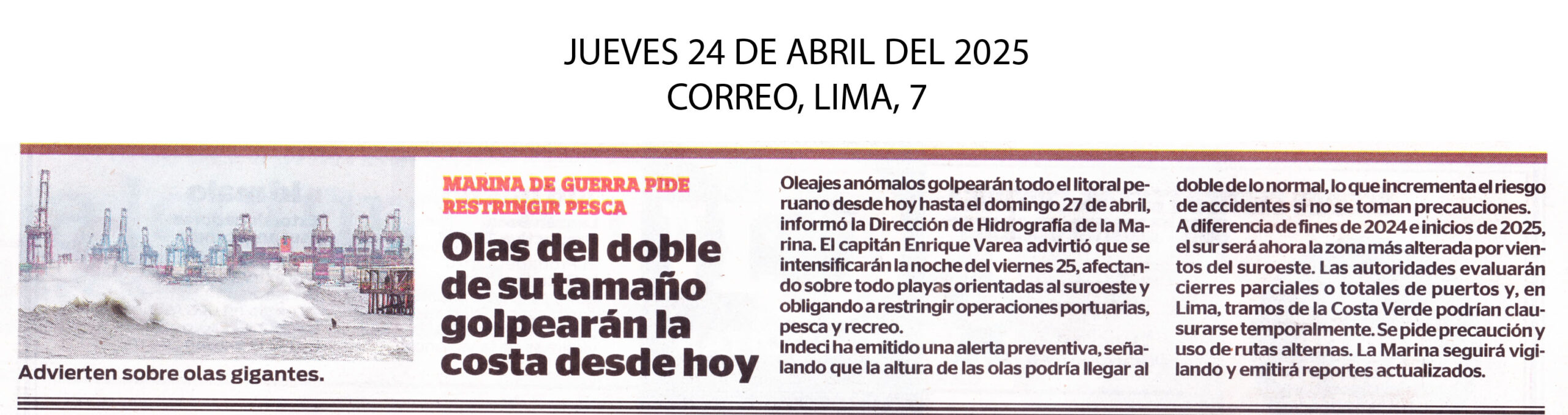 Oleajes anómalos golpearán todo el litoral peruano desde hoy hasta el domingo 27 de abril, informó la Dirección de Hidrografía de la Marina. El capitán Enrique Varea advirtió que se intensificarán la noche del viernes 25, afectando sobre todo playas orientadas al suroeste y obligando a restringir operaciones portuarias, pesca y recreo.