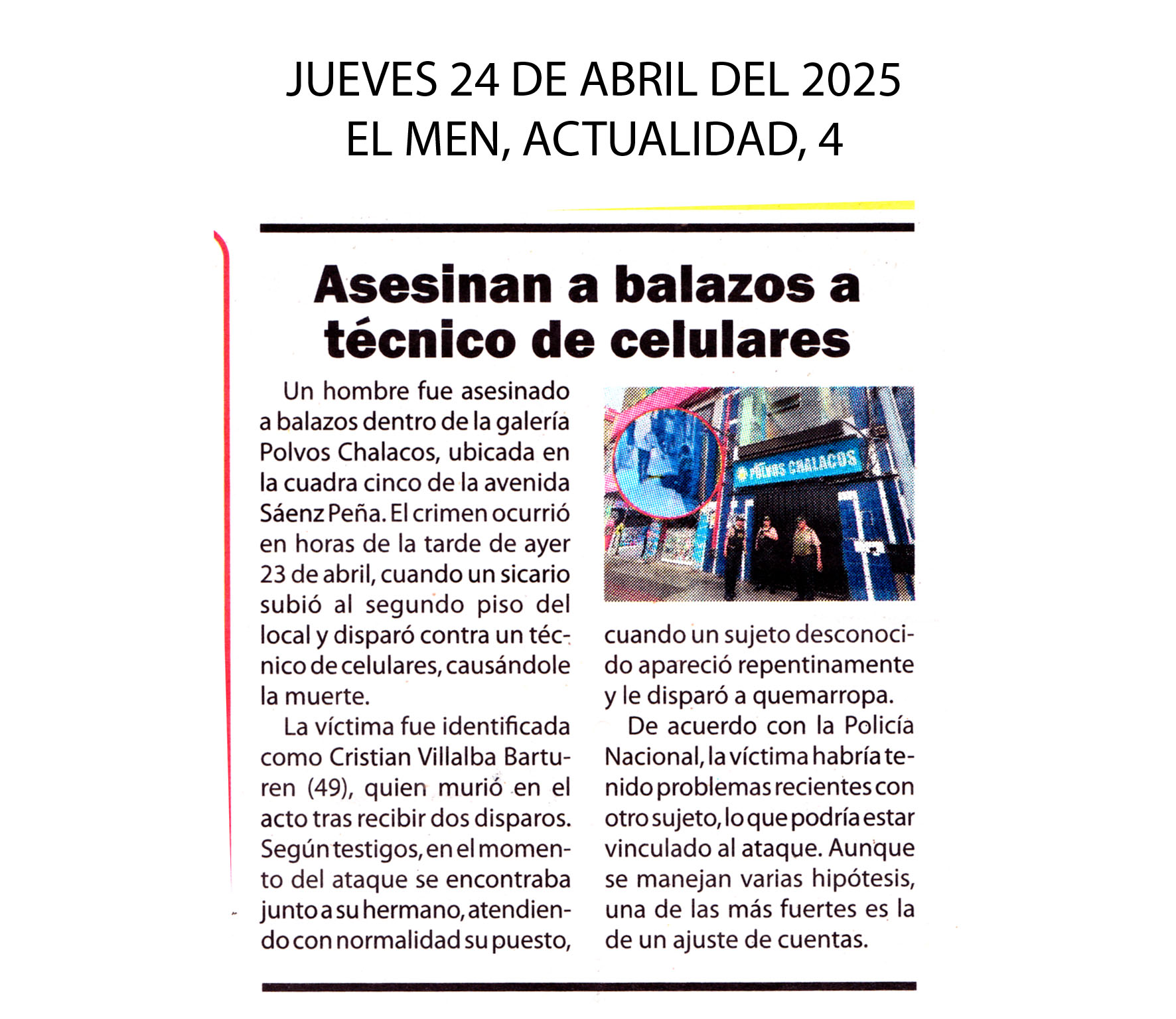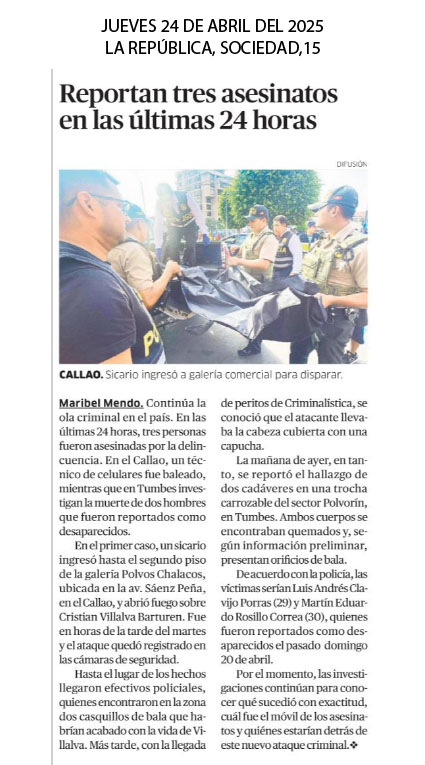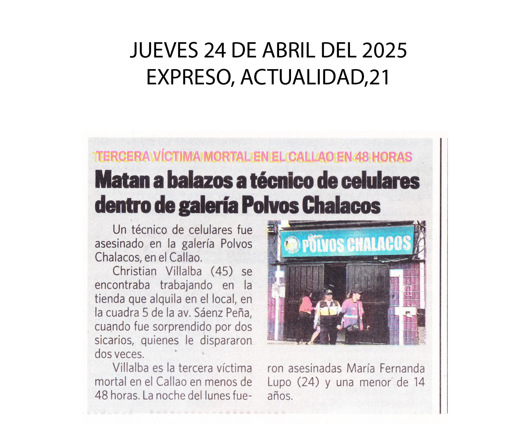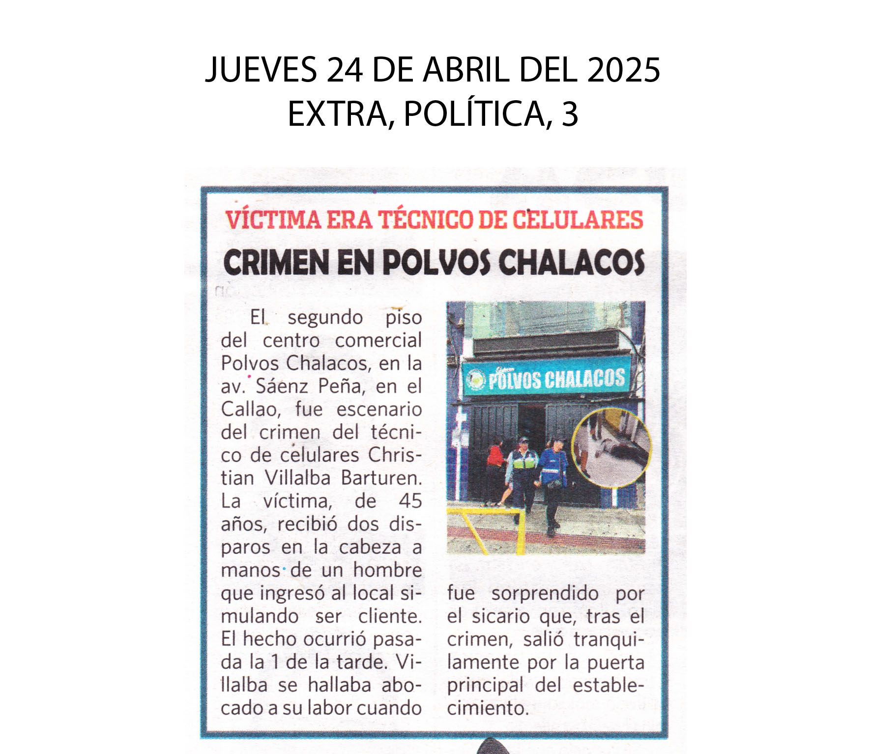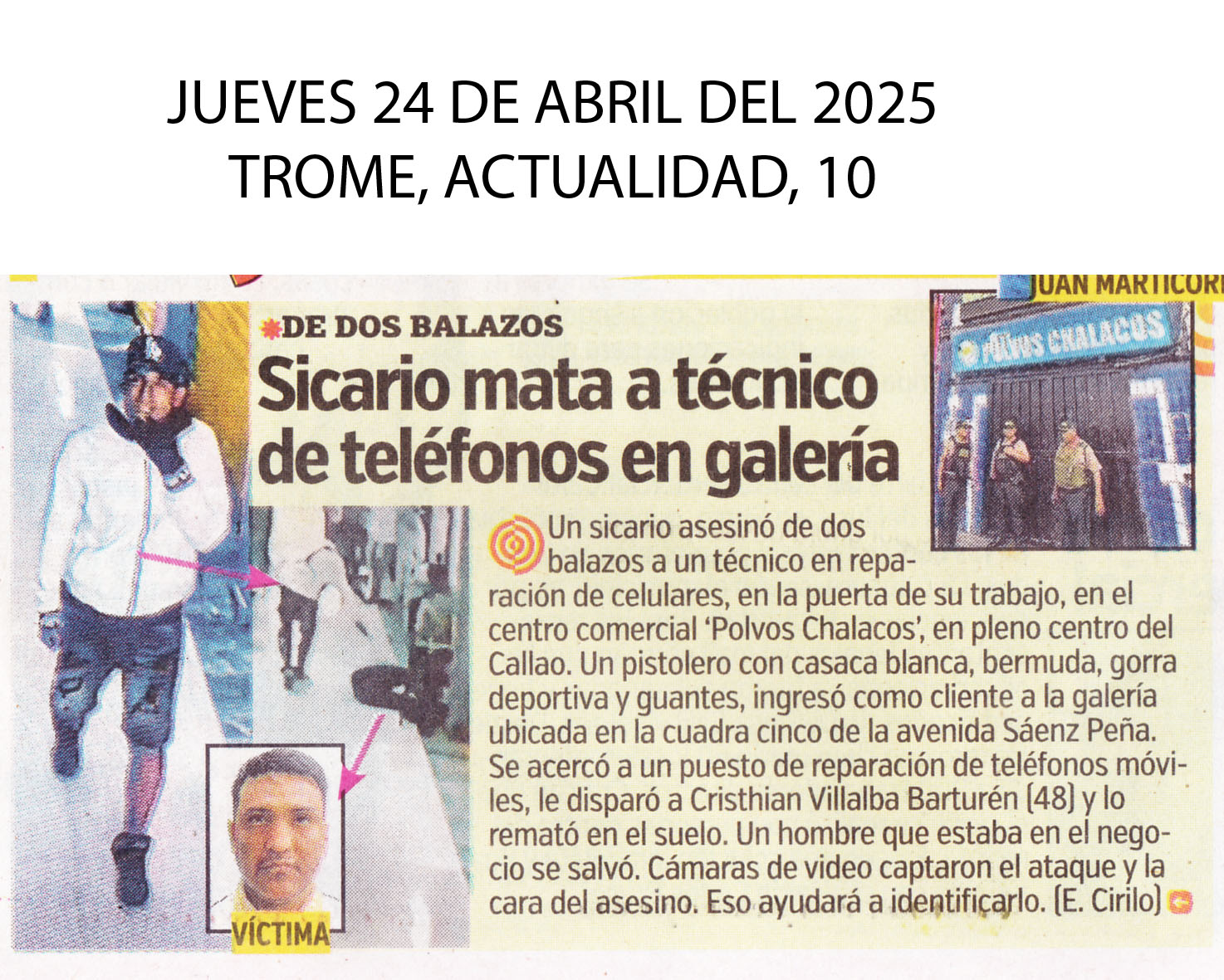 Continúa la ola criminal en el país. En el Callao, un técnico de celulares de nombre Cristian Villalba Barturen, fue baleado en el segundo piso de la galería Polvos Chalacos, ubicada en la av. Sáenz Peña. Al lugar de los hechos llegaron efectivos policiales, quienes encontraron en la zona dos casquillos de bala que habría acabado con la vida de Villalba.