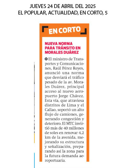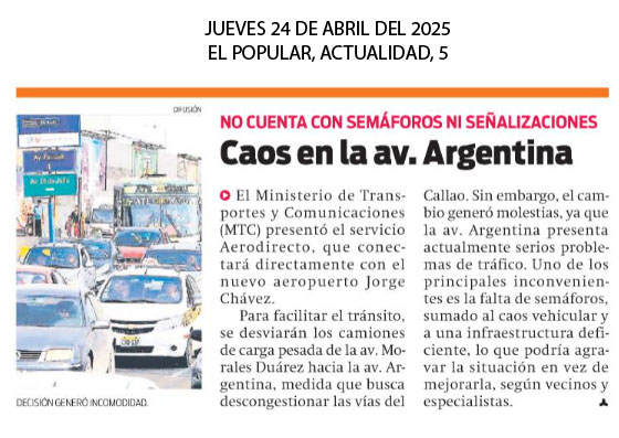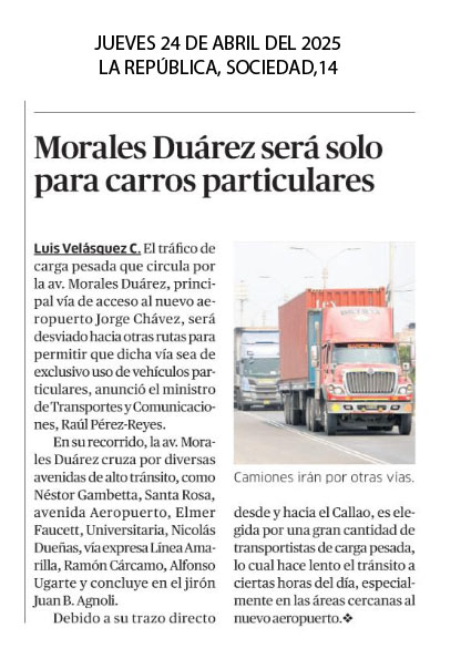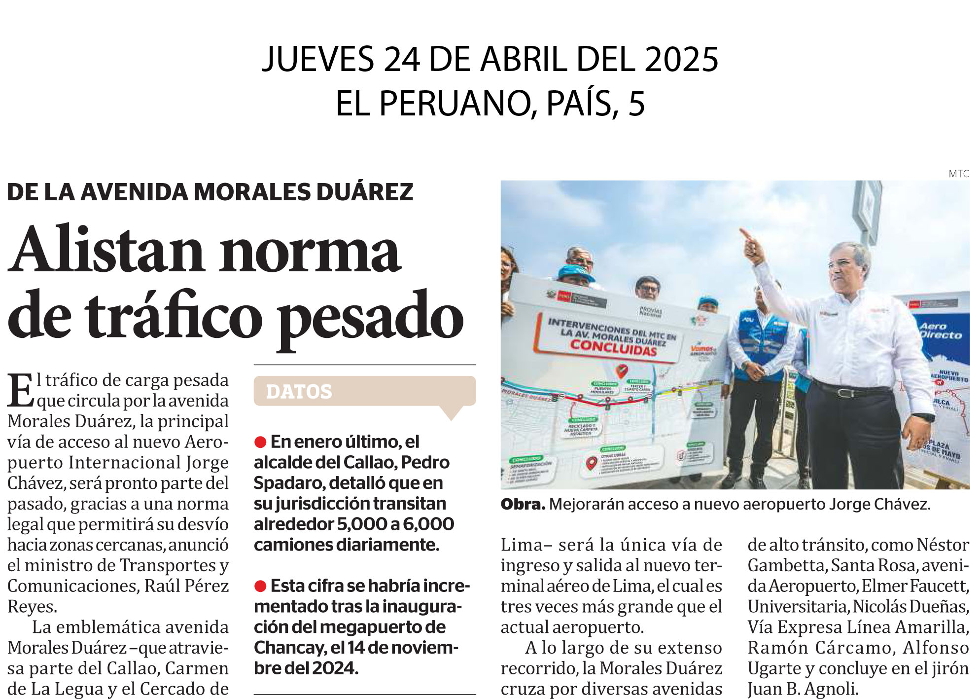 El Ministerio de Transportes y Comunicaciones (MTC) present el servicio Aerodirecto, que conectará directamente con el nuevo aeropuerto Jorge Chávez. Para facilitar el tránsito se desviarán los camiones de carga pesada de la av. Morales Duárez hacia la avenida Argentina, medida que busca descongestionar las vías del Callao, sin embargo, el cambio generó molestías.