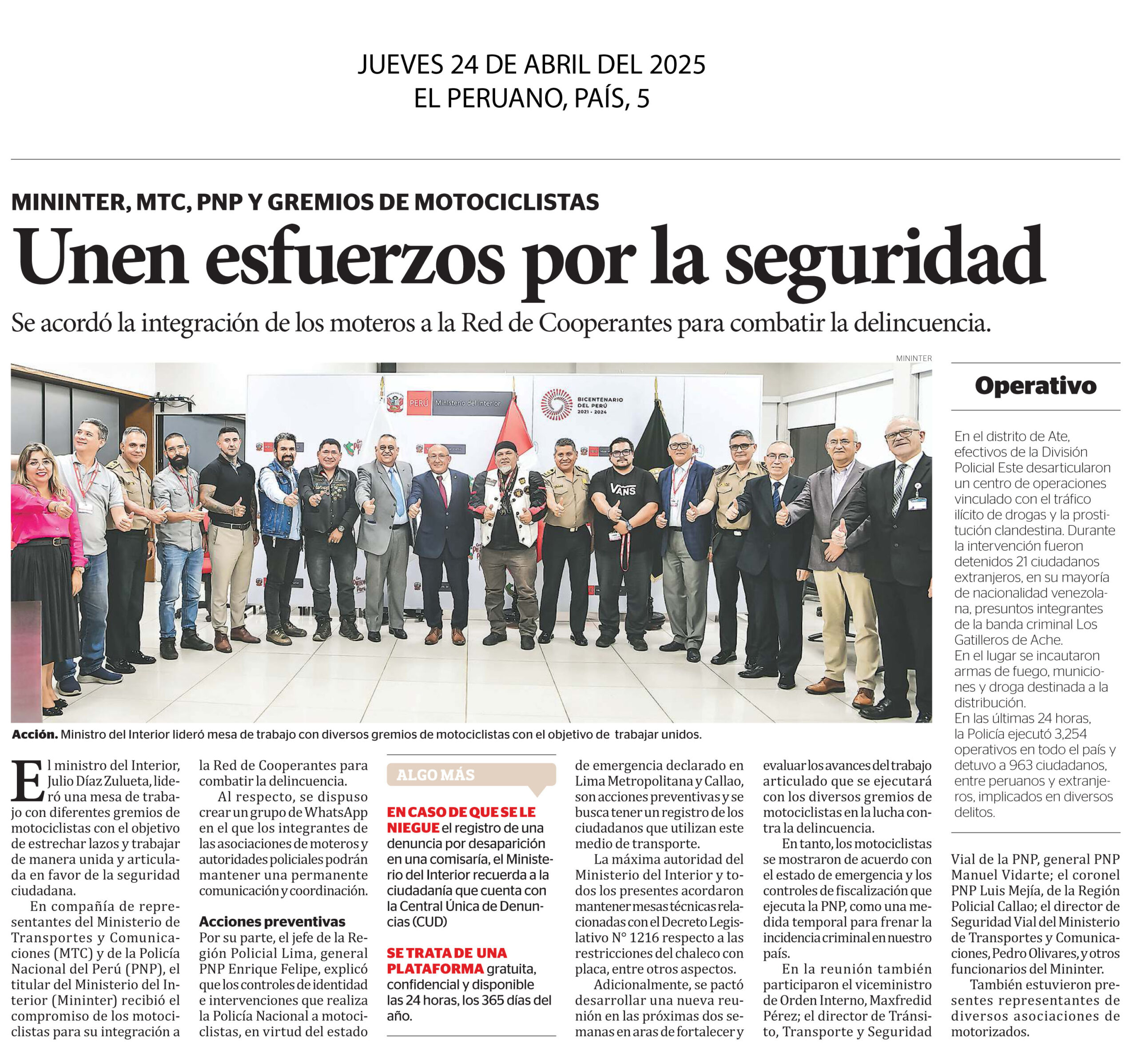 El ministro del Interior, Julio Díaz Zulueta, lideró una mesa de trabajo con diferentes gremios de motociclistas con el objetivo de estrechar lazos y trabajar de manera unida y articulada en favor de la seguridad ciudadana. En compañía de representantes del Ministerio de Transportes y Comunicaciones (MTC) y de la Policía Nacional del Perú (PNP), el titular del Ministerio del Interior (Mininter) recibió el compromiso de los motociclistas para su integración a la Red de Cooperantes para combatir la delincuencia. En la reunión también participaron el viceministro de Orden Interno, Maxfredid Pérez; el director de Tránsito, Transporte y Seguridad Vial de la PNP, general PNP Manuel Vidarte; el coronel PNP Luis Mejía, de la Región Policial Callao; el director de Seguridad Vial del Ministerio de Transportes y Comunicaciones, Pedro Olivares, y otros funcionarios del Mininter.