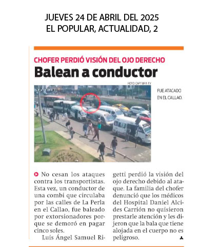 No cesan los ataqus contra los transportistas. Esta vez, un conductor de una combi que circulaba por las calles de La Perla en el Callao, fue baleado por extorsionadores porque se demoró en pago cinco soles. Luis Ángel Samuel Rigetti perdió la vision del ojo derecho debido al ataque.