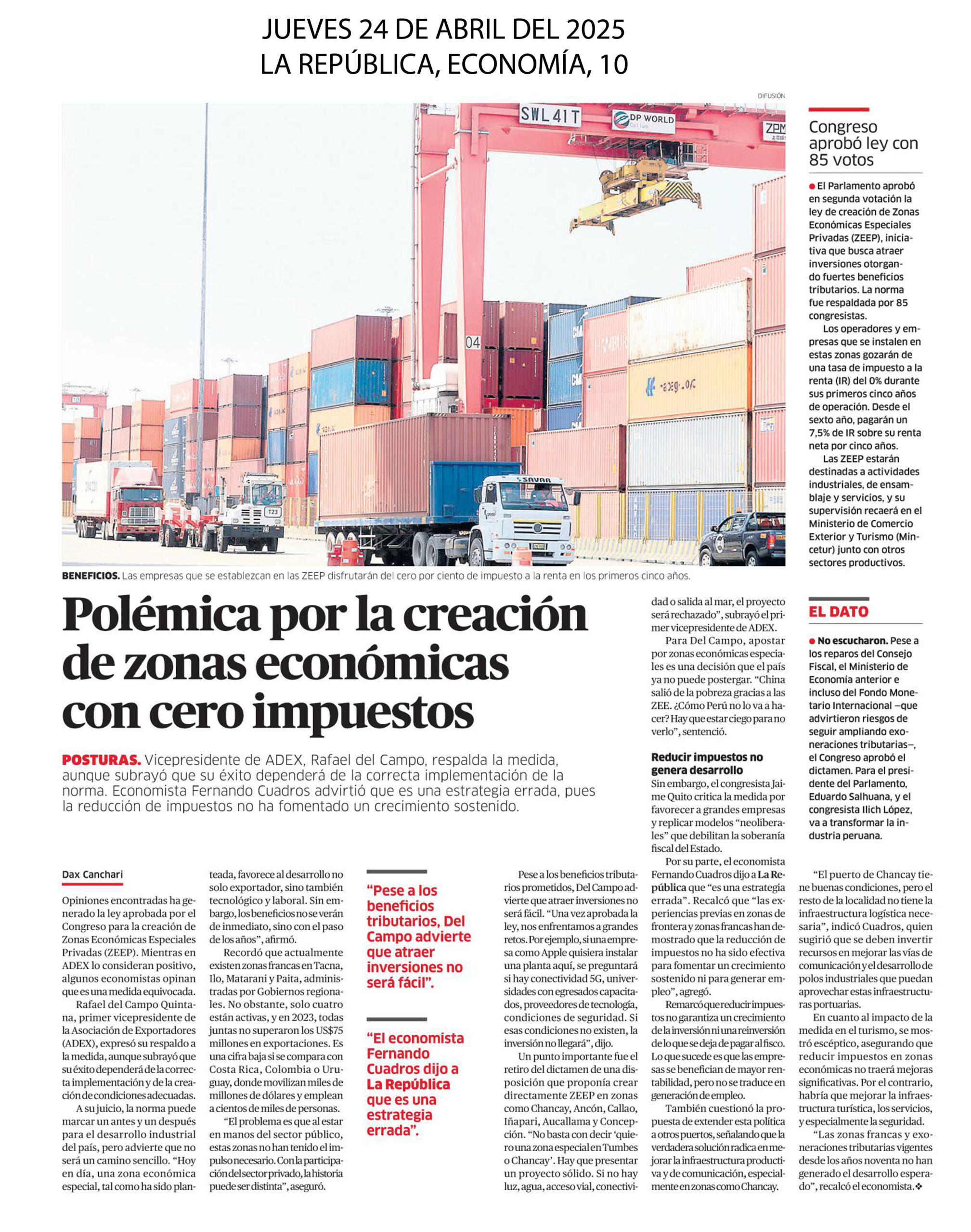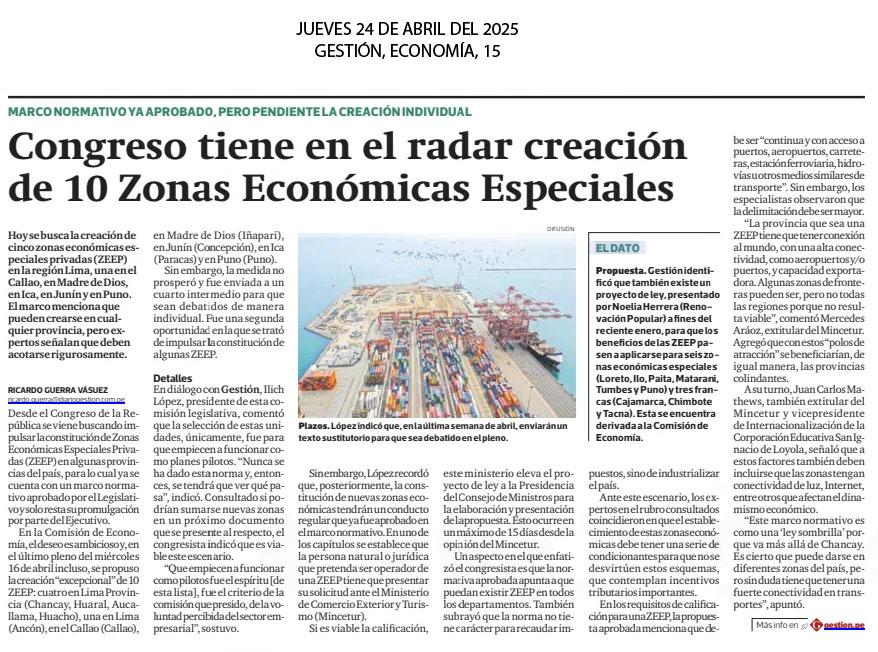 Desde el Congreso de la República se viene buscando impulsar la constitución de Zonas Económicas Especiales Privadas (ZEEP) en algunas provincias del país, para lo cual ya se cuenta con un marco normativo aprobado por el Legislativo y solo resta su promulgación por parte del Ejecutivo. En la Comisión de Economía, el deseo es ambicioso y, en el ultimo pleno del miércoles 16 de abril incluso, se propuso la creación “excepcional” de 10 ZEEP: cuatro en Lima Provincia (Chancay, Huaral, Aucallama, Huacho), una en Lima (Ancón), en el Callao (Callao), en Madre de Dios (Iñapari), en Junín (Concepción), en Ica (Paracas) y en Puno (Puno).