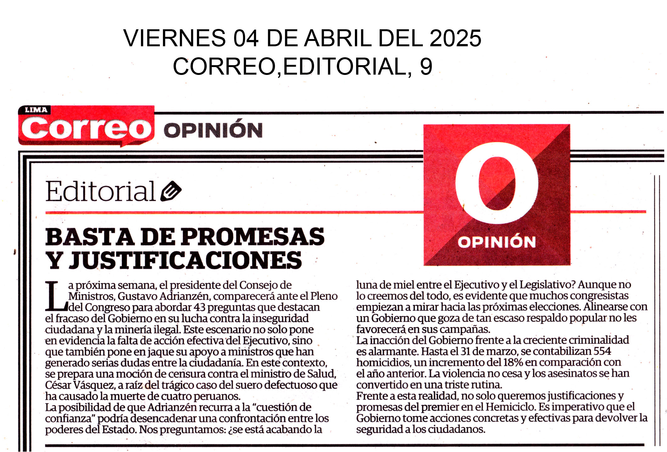 Basta de promesas y justificaciones La próxima semana, el presidente del Consejo de Ministros, Gustavo Adrianzén, comparecerá ante el Pleno del Congreso para abordar 43 preguntas que destacan el fracaso del Gobierno en su lucha contra la inseguridad ciudadana y la minería ilegal. Este escenario no solo pone en evidencia la falta de acción efectiva del Ejecutivo, sino que también pone en jaque su apoyo a ministros que han generado serias dudas entre la ciudadanía. En este contexto, se prepara una moción de censura contra el ministro de Salud, César Vásquez, a raíz del trágico caso del suero defectuoso que ha causado la muerte de cuatro peruanos. Correo, Editorial, 9