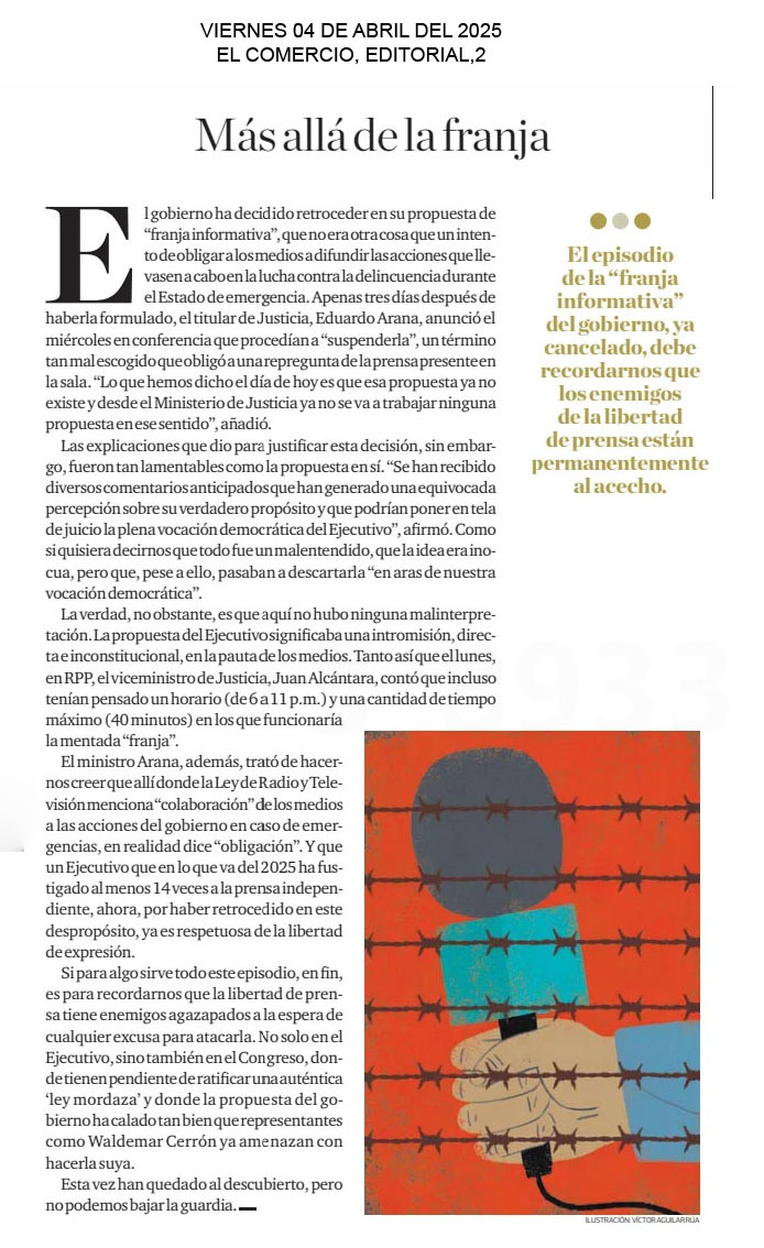 Más allá de la franja El gobierno ha decidido retroceder en su propuesta de “franja informativa”, que no era otra cosa que un intento de obligar a los medios a difundir las acciones que llevasen a cabo en la lucha contra la delincuencia durante el Estado de emergencia. Apenas tres días después de haberla formulado, el titular de Justicia, Eduardo Arana, anunció el miércoles en conferencia que procedían a “suspenderla”, un término tan mal escogido que obligó a una repregunta de la prensa presente en la sala. “Lo que hemos dicho el día de hoy es que esa propuesta ya no existe y desde el Ministerio de Justicia ya no se va a trabajar ninguna propuesta en ese sentido”, añadió.