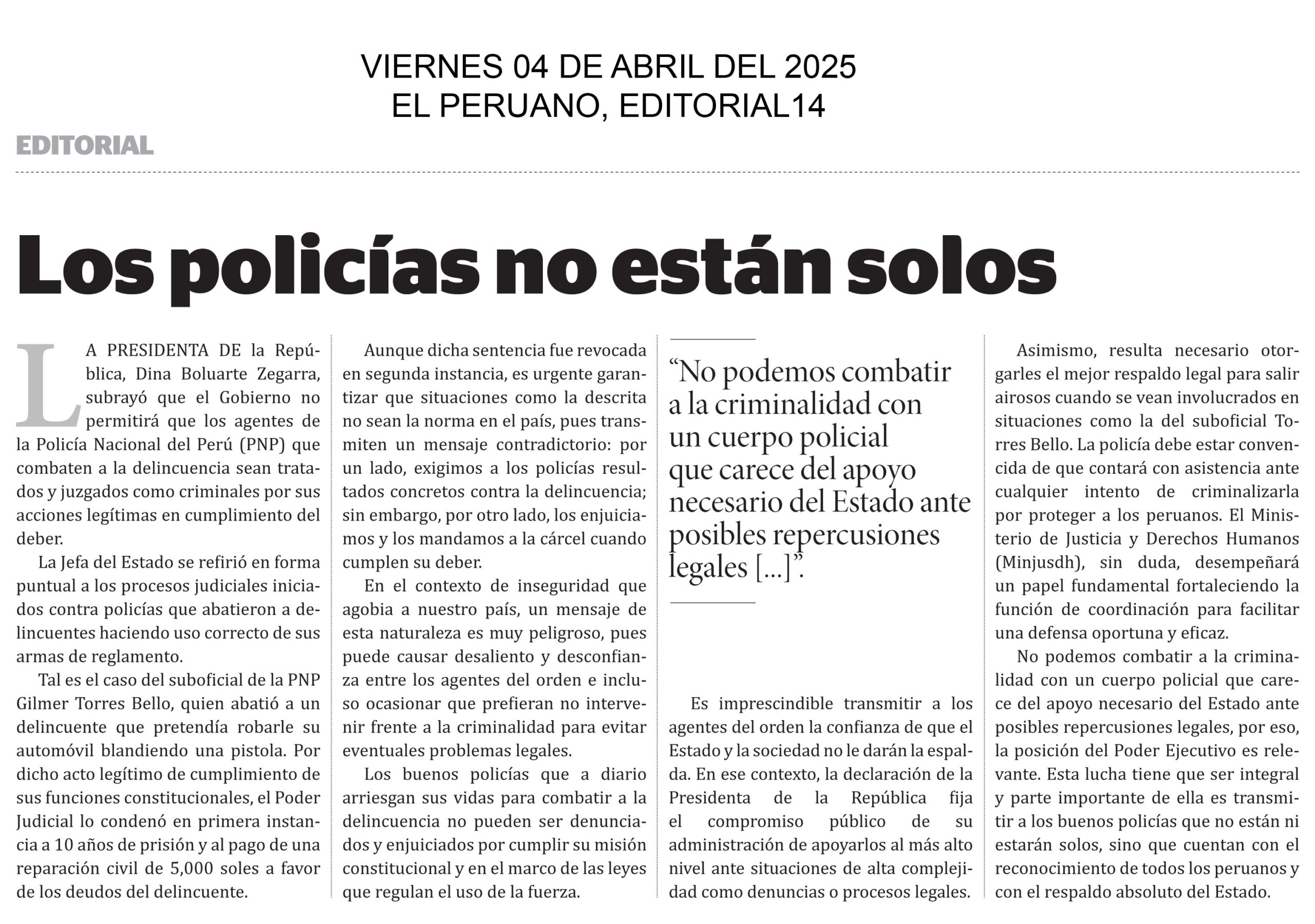 Los policías no están solos La Presidenta de la República, Dina Boluarte Zegarra, subrayó que el Gobierno no permitirá que los agentes de la Policía Nacional del Perú (PNP) que combaten a la delincuencia sean tratados y juzgados como criminales por sus acciones legítimas en cumplimiento del deber. La Jefa del Estado se refirió en forma puntual a los procesos judiciales iniciados contra policías que abatieron a delincuentes haciendo uso correcto de sus armas de reglamento. Tal es el caso del suboficial de la PNP Gilmer Torres Bello, quien abatió a un delincuente que pretendía robarle su automóvil blandiendo una pistola. Por dicho acto legítimo de cumplimiento de sus funciones constitucionales, el Poder Judicial lo condenó en primera instancia a 10 años de prisión y al pago de una reparación civil de 5,000 soles a favor de los deudos del delincuente.