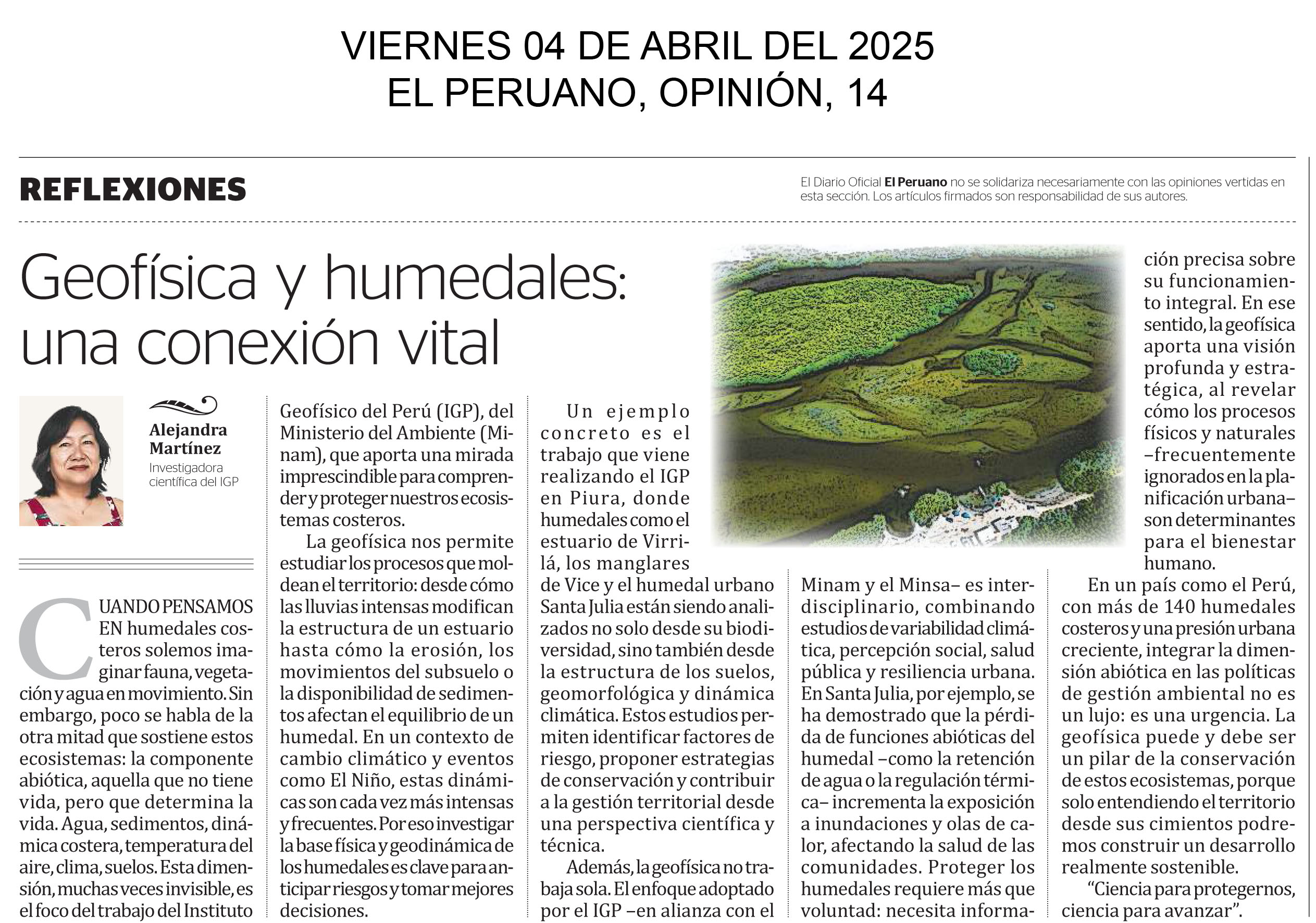 Geofísica y humedales: una conexión vital Artículo de Alejandra Martínez (Investigadora científica del IGP). “Cuando pensamos en humedales costeros solemos imaginar fauna, vegetación y agua en movimiento. Sin embargo, poco se habla de la otra mitad que sostiene estos ecosistemas: la componente abiótica, aquella que no tiene vida, pero que determina la vida. Agua, sedimentos, dinámica costera, temperatura del aire, clima, suelos. Esta dimensión, muchas veces invisible, es el foco del trabajo del Instituto Geofísico del Perú (IGP), del Ministerio del Ambiente (Minam), que aporta una mirada imprescindible para comprender y proteger nuestros ecosistemas costeros…”.