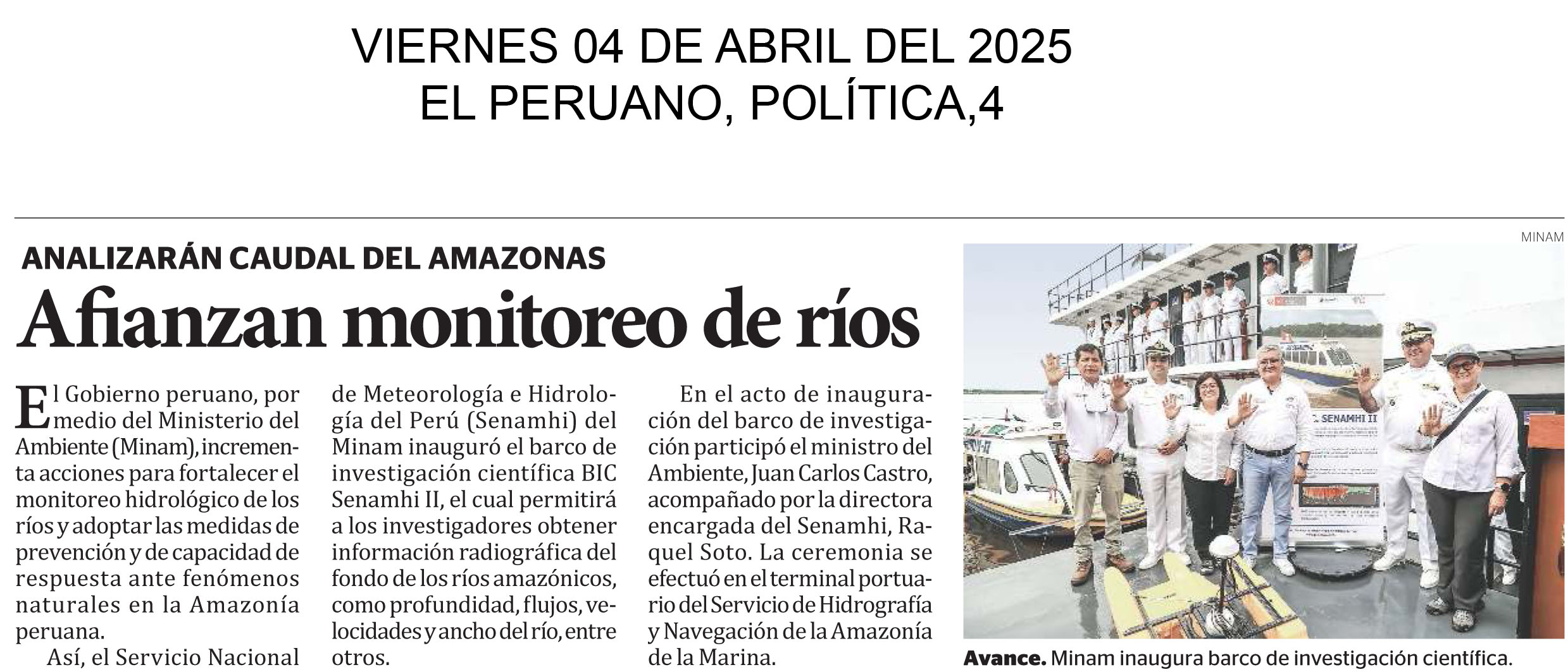 Afianzan monitoreo de ríos El Gobierno peruano, por medio del Ministerio del Ambiente (Minam), incrementa acciones para fortalecer el monitoreo hidrológico de los ríos y adoptar las medidas de prevención y de capacidad de respuesta ante fenómenos naturales en la Amazonía peruana. Así, el Servicio Nacional de Meteorología e Hidrología del Perú (Senamhi) del Minam inauguró el barco de investigación científica BIC Senamhi II, el cual permitirá a los investigadores obtener información radiográfica del fondo de los ríos amazónicos, como profundidad, flujos, velocidades y ancho del río, entre otros.