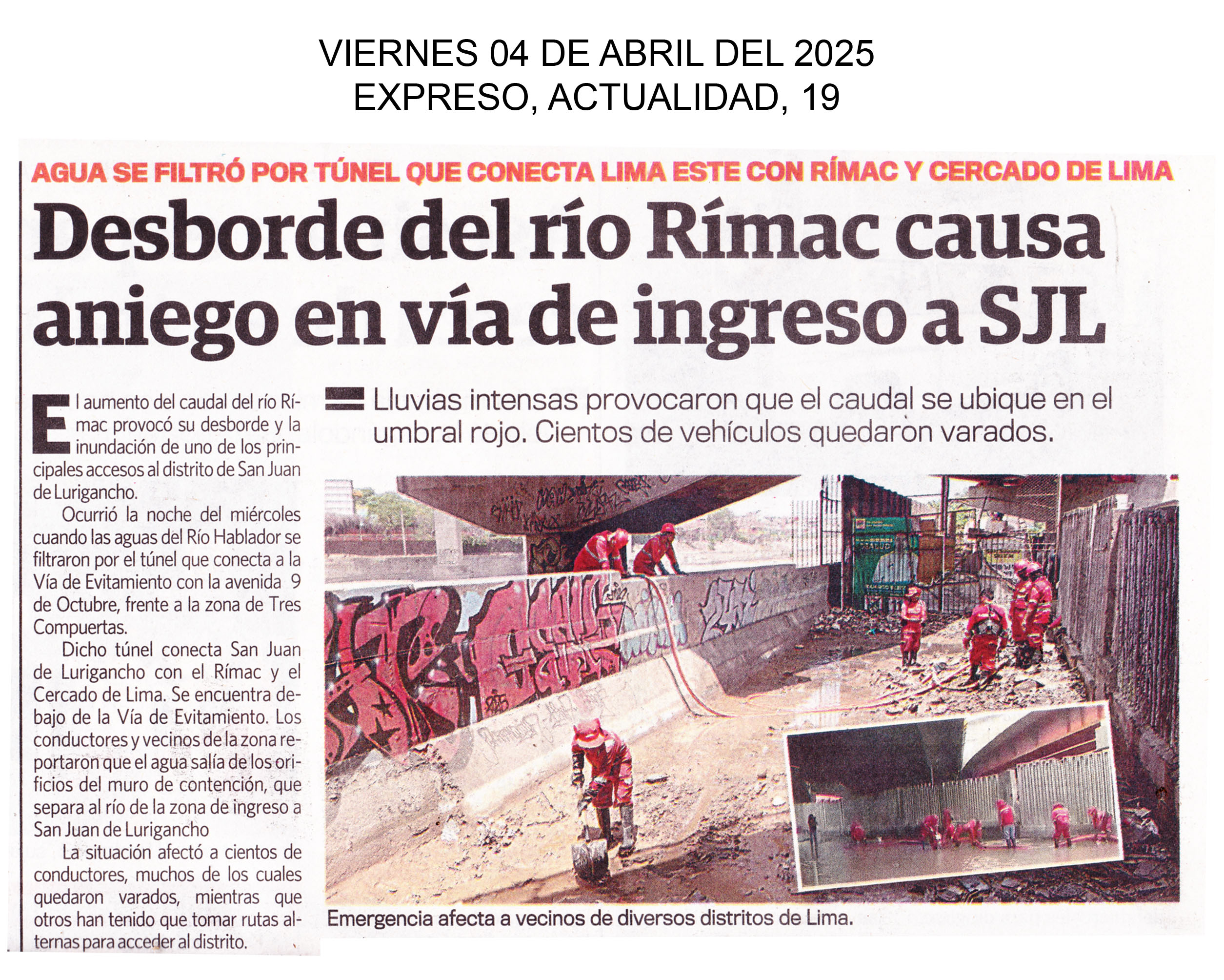 Desborde del río Rímac causa aniego en vía de ingreso a SJL El aumento del caudal del río Rímac provocó su desborde y la inundación de uno de los principales accesos al distrito de San Juan de Lurigancho. Ocurrió la noche del miércoles cuando las aguas del río hablador se filtraron por el túnel que conecta a la Vía Evitamiento con la avenida 9 de Octubre, frente a la zona de Tres Compuertas Expreso, Actualidad, 19