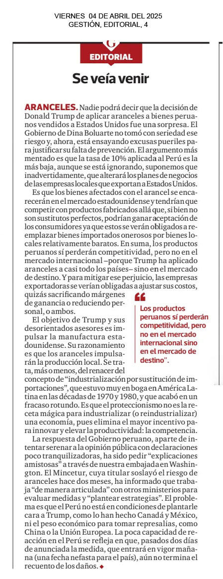 Se veía venir Nadie podrá decir que la decisión de Donald Trump de aplicar aranceles a bienes peruanos vendidos a Estados Unidos fue una sorpresa. El Gobierno de Dina Boluarte no tomó con seriedad ese riesgo y, ahora, está ensayando excusas pueriles para justificar su falta de prevención. El argumento más mentado es que la tasa de 10% aplicada al Perú es la más baja, aunque se está ignorando, suponemos que inadvertidamente, que alterará los planes de negocios de las empresas locales que exportan a Estados Unidos. Es que los bienes afectados con el arancel se encarecerán en el mercado estadounidense y tendrían que competir con productos fabricados allá que, si bien no son sustitutos perfectos, podrían ganar aceptación de los consumidores ya que estos se verán obligados a reemplazar bienes importados onerosos por bienes locales relativamente baratos.