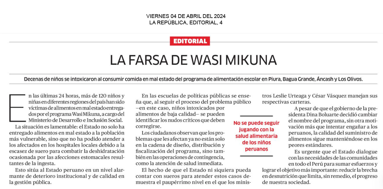 La farsa de Wasi Mikuna En las últimas 24 horas, más de 120 niños y niñas en diferentes regiones del país han sido víctimas de alimentos en mal estado entregados por el programa Wasi Mikuna, a cargo del Ministerio de Desarrollo e Inclusión Social. La situación es lamentable: el Estado no solo ha entregado alimentos en mal estado a la población más vulnerable, sino que no ha podido atender a los afectados en los hospitales locales debido a la escasez de suero para combatir la deshidratación ocasionada por las afecciones estomacales resultantes de la ingesta. Esto sitúa al Estado peruano en un nivel alarmante de deterioro institucional y de calidad en la gestión pública.