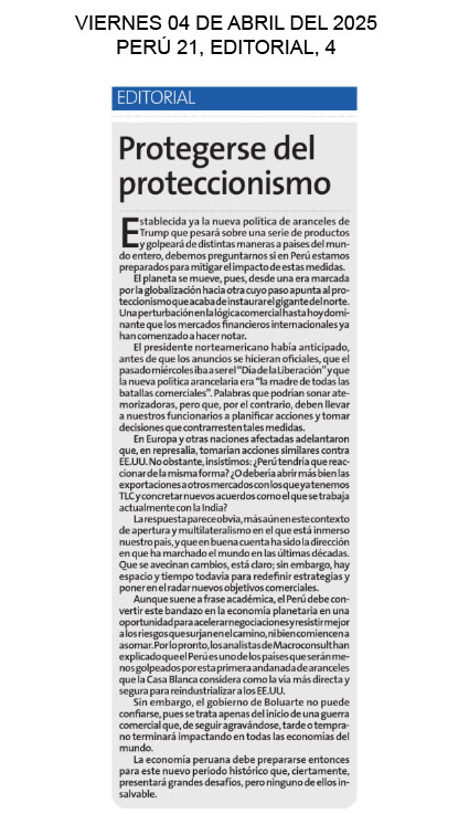 Protegerse del proteccionismo Establecida ya la nueva política de aranceles de Trump que pesará sobre una serie de productos y golpeará de distintas maneras a países del mundo entero, debemos preguntarnos si en Perú estamos preparados para mitigar el impacto de estas medidas. El planeta se mueve, pues, desde una era marcada por la globalización hacia otra cuyo paso apunta al proteccionismo que acaba de instaurar el gigante del norte. Una perturbación en la lógica comercial hasta hoy dominante que los mercados financieros internacionales ya han comenzado a hacer notar. El presidente norteamericano había anticipado, antes de que los anuncios se hicieran oficiales, que el pasado miércoles iba a ser el “Día de la Liberación” y que la nueva política arancelaria era “la madre de todas las batallas comerciales”. Palabras que podrían sonar atemorizadoras, pero que, por el contrario, deben llevar a nuestros funcionarios a planificar acciones y tomar decisiones que contrarresten tales medidas Perú21, Editorial, 4 |