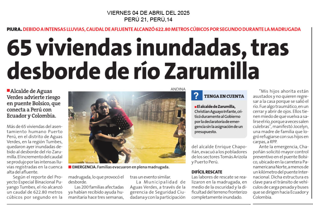 65 viviendas inundadas, tras desborde de río Zarumilla Más de 65 viviendas del asentamiento humano Puerto Perú, en el distrito de Aguas Verdes, en la región Tumbes, quedaron ayer inundadas debido al desborde del río Zarumilla. El incremento del caudal se produjo por las intensas lluvias registradas en la cuenca alta del afluente. Según el reporte del Proyecto Especial Binacional Puyango Tumbes, el río alcanzó un caudal de 622.80 metros cúbicos por segundo en la madrugada, lo que provocó el desborde. Las 200 familias afectadas ya habían recibido ayuda humanitaria hace tres semanas, tras un evento similar. La Municipalidad de Aguas Verdes, a través de la gerencia de Seguridad Ciudadana y con la participación del alcalde Enrique Chapoñán, evacuó a los pobladores de los sectores Tomás Arizola y Puerto Perú.