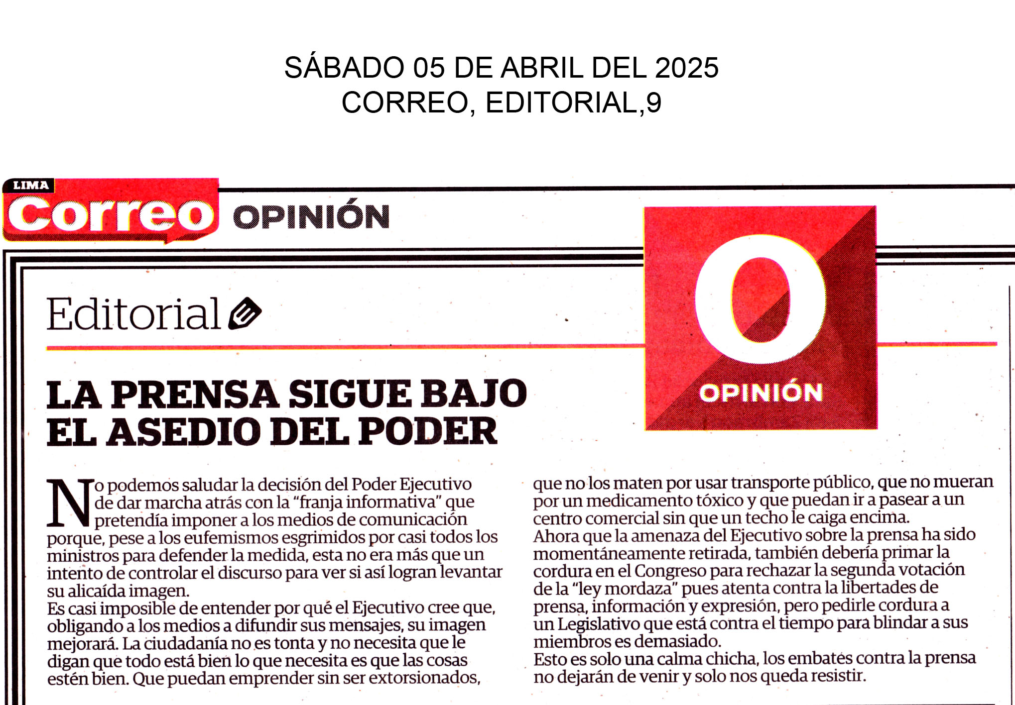 La prensa sigue bajo el asedio del poder No podemos saludar la decisión del Poder Ejecutivo de dar marcha atrás con la “franja informativa” que pretendía imponer a los medios de comunicación porque, pese a los eufemismos esgrimidos por casi todos los ministros para defender la medida, esta no era más que un intento de controlar el discurso para ver si así logran levantar su alicaída imagen. Es casi imposible de entender por qué el Ejecutivo cree que, obligando a los medios a difundir sus mensajes, su imagen mejorará. La ciudadanía no es tonta y no necesita que le digan que todo está bien lo que necesita es que las cosas estén bien. Que puedan emprender sin ser extorsionados, que no los maten por usar transporte público, que no mueran por un medicamento tóxico y que puedan ir a pasear a un centro comercial sin que un techo le caiga encima. Correo, Editorial, 9 |