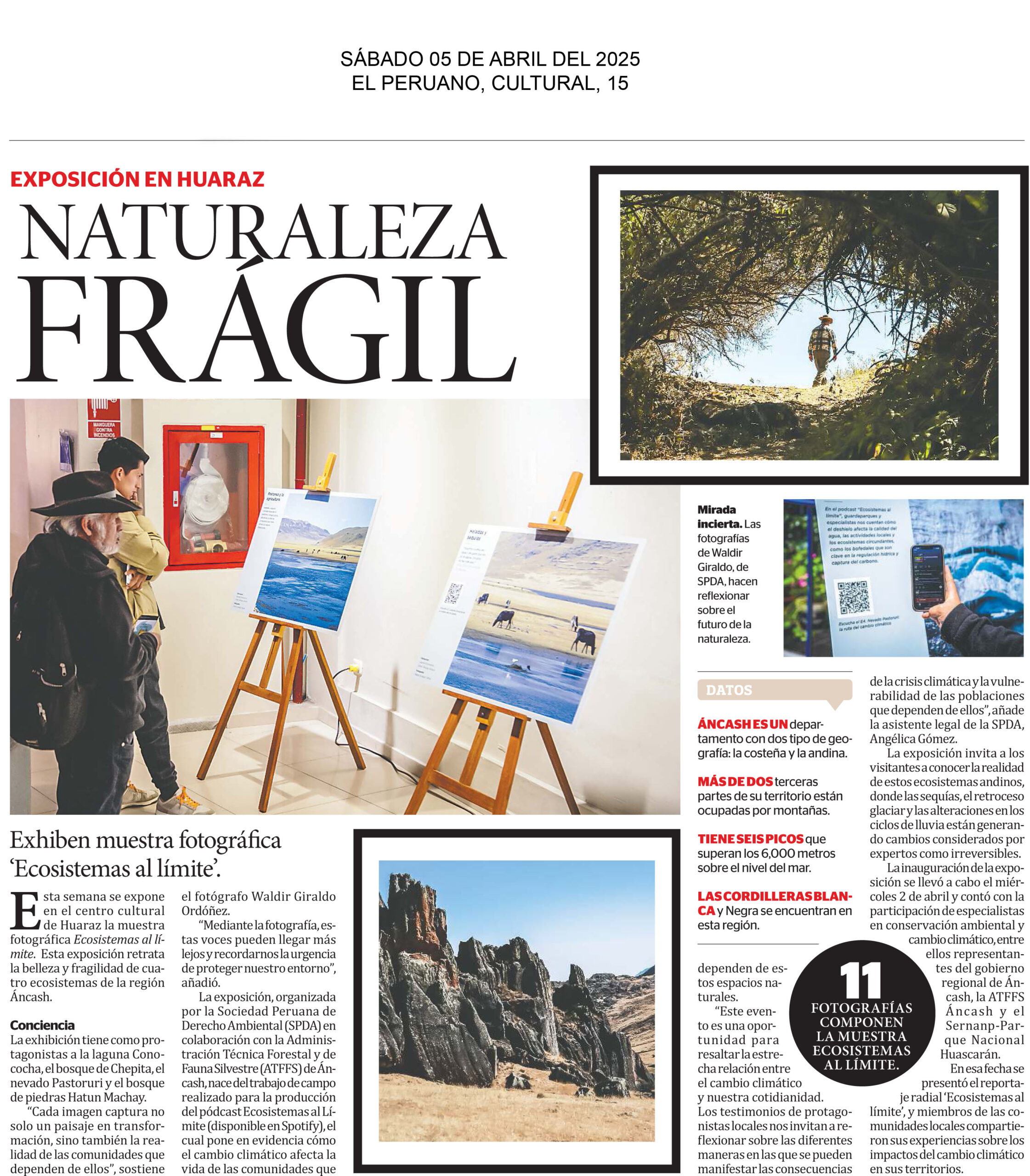 Naturaleza Frágil Esta semana se expone en el centro cultural de Huaraz la muestra fotográfica Ecosistemas al límite. Esta exposición retrata la belleza y fragilidad de cuatro ecosistemas de la región Áncash. La exhibición tiene como protagonistas a la laguna Conococha, el bosque de Chepita, el nevado Pastoruri y el bosque de piedras Hatun Machay. “Este evento es una oportunidad para resaltar la estrecha relación entre el cambio climático y nuestra cotidianidad. Los testimonios de protagonistas locales nos invitan a reflexionar sobre las diferentes maneras en las que se pueden manifestar las consecuencias de la crisis climática y la vulnerabilidad de las poblaciones que dependen de ellos”, añade la asistente legal de la SPDA, Angélica Gómez. El Peruano, Cultural, 15 |