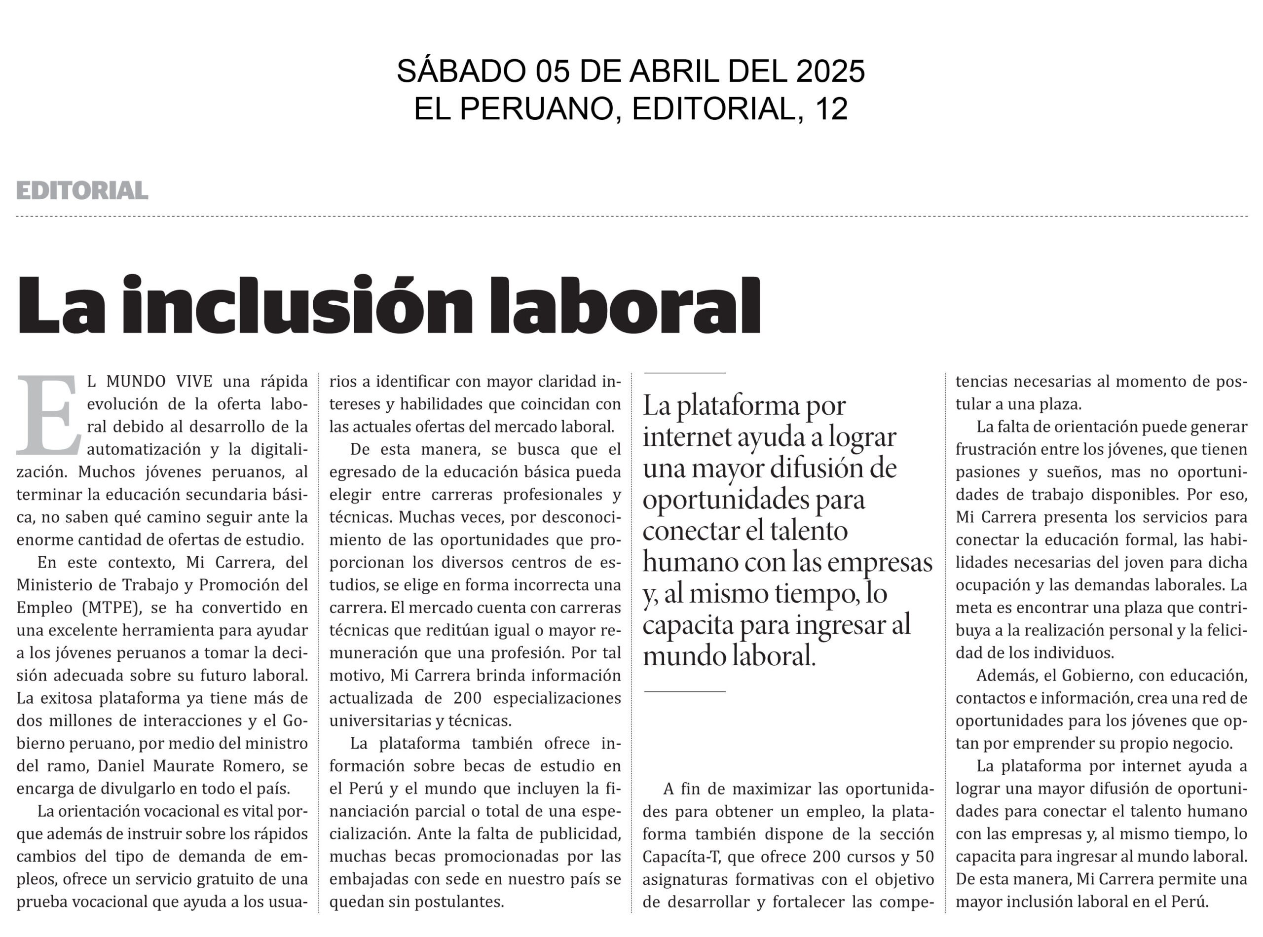 La inclusión laboral El mundo vive una rápida evolución de la oferta laboral debido al desarrollo de la automatización y la digitalización. Muchos jóvenes peruanos, al terminar la educación secundaria básica, no saben qué camino seguir ante la enorme cantidad de ofertas de estudio. En este contexto, Mi Carrera, del Ministerio de Trabajo y Promoción del Empleo (MTPE), se ha convertido en una excelente herramienta para ayudar a los jóvenes peruanos a tomar la decisión adecuada sobre su futuro laboral. La exitosa plataforma ya tiene más de dos millones de interacciones y el Gobierno peruano, por medio del ministro del ramo, Daniel Maurate Romero, se encarga de divulgarlo en todo el país.