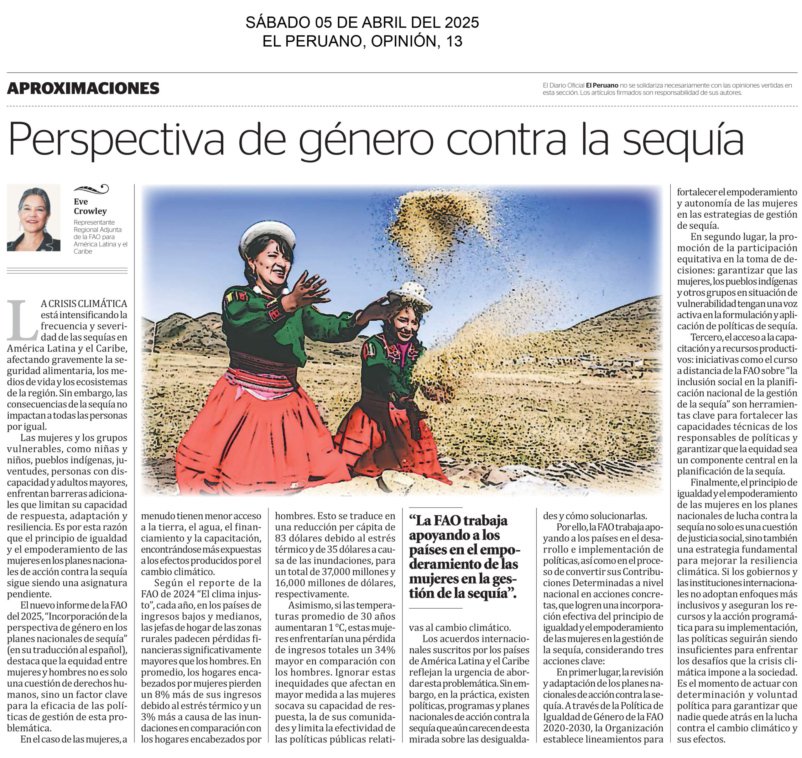 Perspectiva de género contra la sequía Artículo de Eve Crowley, representante regional adjunta de la FAO para América Latina y el Caribe. “La crisis climática está intensificando la frecuencia y severidad de las sequías en América Latina y el Caribe, afectando gravemente la seguridad alimentaria, los medios de vida y los ecosistemas de la región. Sin embargo, las consecuencias de la sequía no impactan a todas las personas por igual. Las mujeres y los grupos vulnerables, como niñas y niños, pueblos indígenas, juventudes, personas con discapacidad y adultos mayores, enfrentan barreras adicionales que limitan su capacidad de respuesta, adaptación y resiliencia…”.