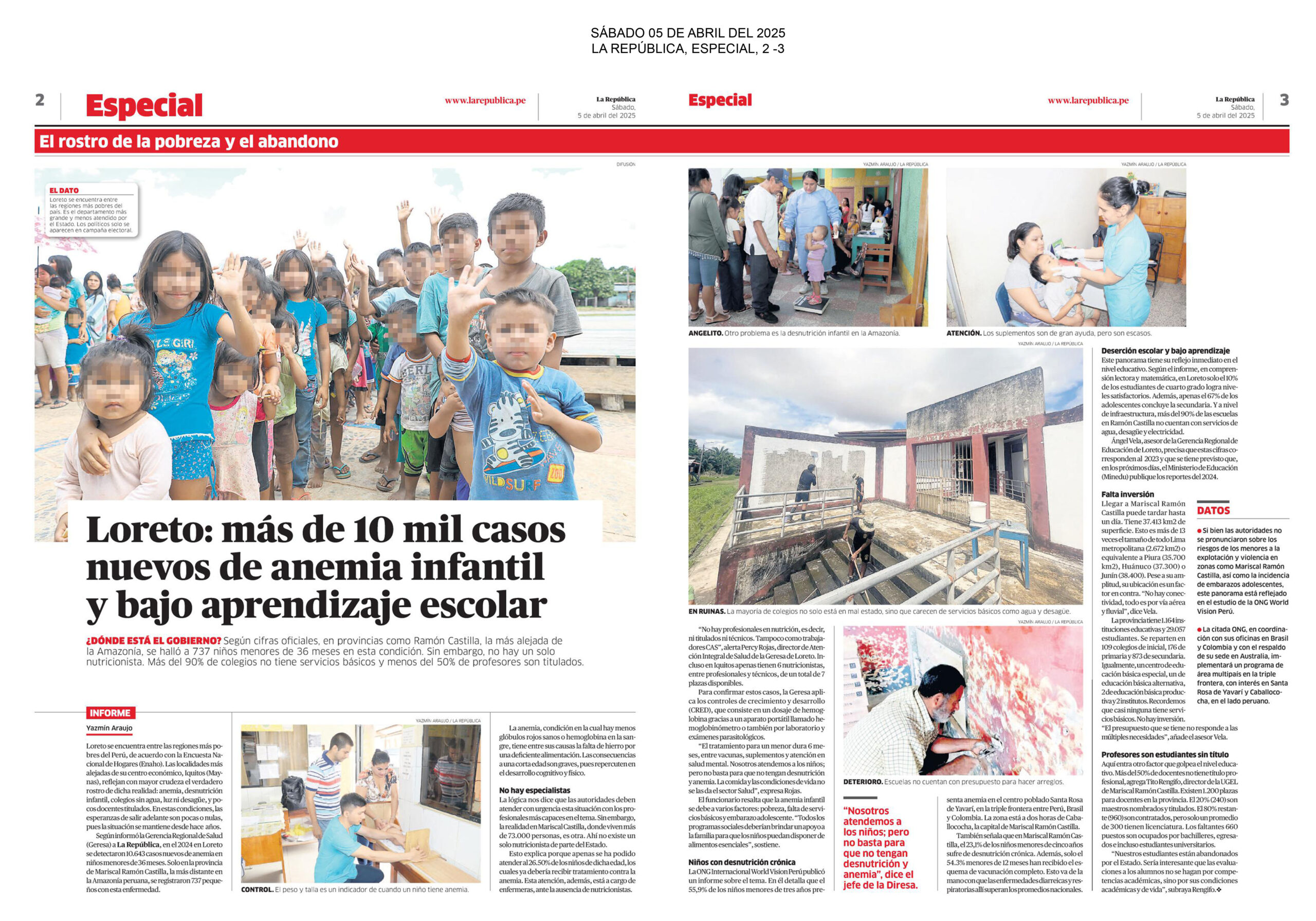 Loreto: más de 10 mil casos nuevos de anemia infantil y bajo aprendizaje escolar Según informó la Gerencia Regional de Salud (Geresa), en el 2024 en Loreto se detectaron 10.643 casos nuevos de anemia en niños menores de 36 meses. Solo en la provincial de Mariscal Ramón Castilla, la más distante en la Amazonía peruano, se registran 737 pequeños con esta enfermedad. Y a nivel de infraestructura, más del 90% de las escuelas en Ramón Castilla no cuenta con servicios de agua, desagüe y electricidad. La República, Especial, 2-3