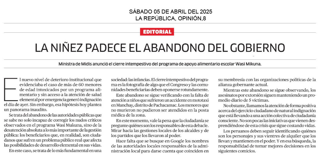 La niñez padece el abandono del gobierno El nuevo nivel de deterioro institucional que evidenciaba el caso de más de 60 menores de edad intoxicados por un programa alimentario y sin acceso a la atención de salud elemental por emergencia generó indignación el día de ayer. Sin embargo, esa hipótesis hoy plantea un panorama inaudito. Se trata del abandono de las autoridades públicas que se sabe no solo incapaz de corregir los nudos críticos observados en el programa Wasi Mukuna, sino de la desatención absoluta a lo más importante de la gestión pública: los beneficiarios que, en realidad, son ciudadanos que sufren un problema público real que afecta las posibilidades de desarrollo elemental en sus vidas.