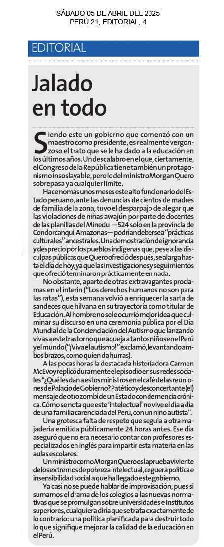 Jalado en todo Siendo este un gobierno que comenzó con un maestro como presidente, es realmente vergonzoso el trato que se le ha dado a la educación en los últimos años. Un descalabro en el que, ciertamente, el Congreso de la República tiene también un protagonismo insoslayable, pero lo del ministro Morgan Quero sobrepasa ya cualquier límite. Hace nomás unos meses este alto funcionario del Estado peruano, ante las denuncias de cientos de madres de familia de la zona, tuvo el desparpajo de alegar que las violaciones de niñas awajún por parte de docentes de las planillas del Minedu —524 solo en la provincia de Condorcanqui, Amazonas— podrían deberse a “prácticas culturales” ancestrales. Una demostración de ignorancia y desprecio por los pueblos indígenas que, pese a las disculpas públicas que Quero ofreció después, se alarga hasta el día de hoy, ya que las investigaciones y seguimientos que ofreció terminaron prácticamente en nada.