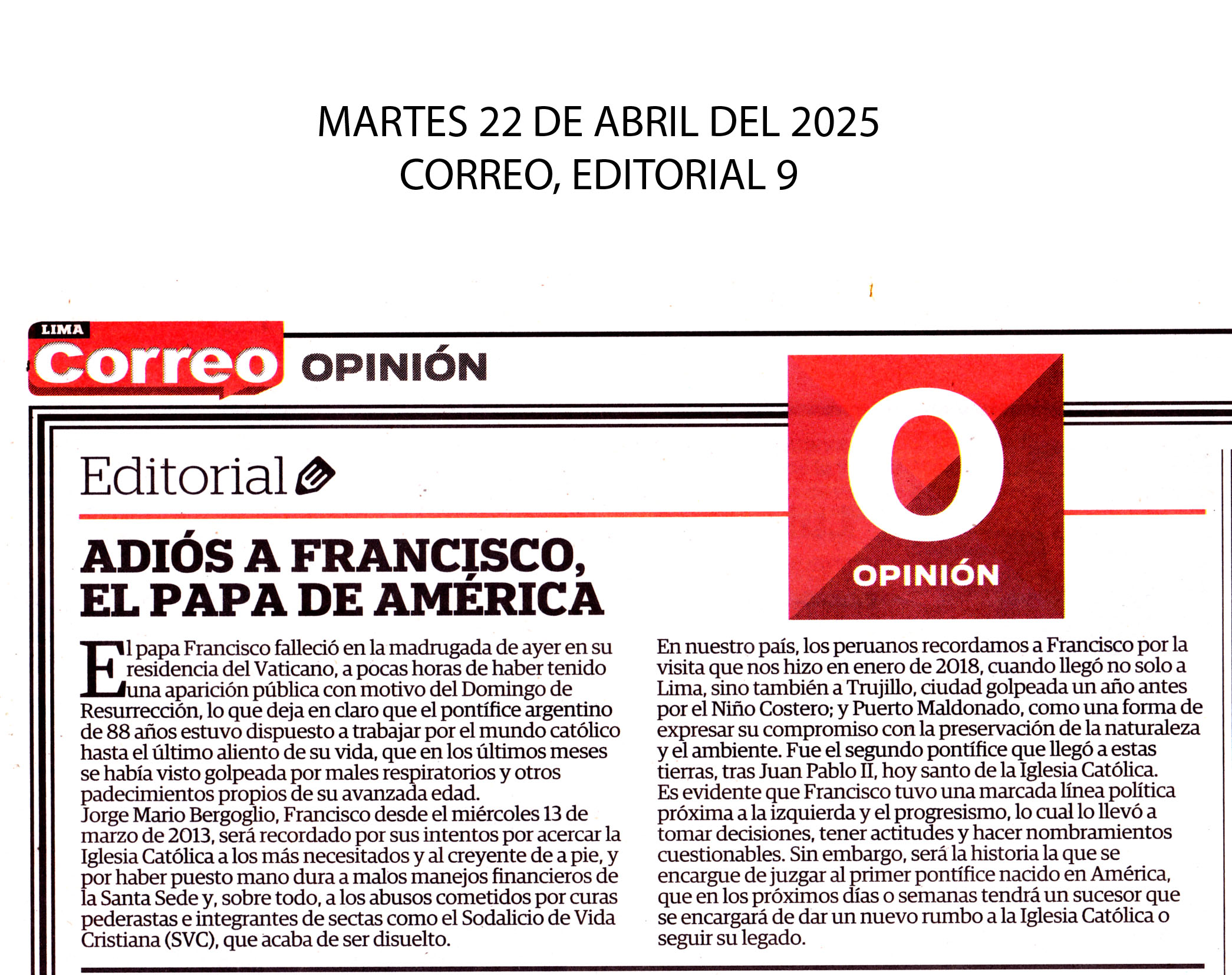 Adiós a Francisco el Papa de América El papa Francisco falleció en la madrugada de ayer en su residencia del Vaticano, a pocas horas de haber tenido una aparición pública con motivo del Domingo de Resurrección, lo que deja en claro que el pontífice argentino de 88 años estuvo dispuesto a trabajar por el mundo católico hasta el último aliento de su vida, que en los últimos meses se había visto golpeada por males respiratorios y otros padecimientos propios de su avanzada edad. Jorge Mario Bergoglio, Francisco desde el miércoles 13 de marzo de 2013, será recordado por sus intentos por acercar la Iglesia Católica a los más necesitados y al creyente de a pie, y por haber puesto mano dura a malos manejos financieros de la Santa Sede y, sobre todo, a los abusos cometidos por curas pederastas e integrantes de sectas como el Sodalicio de Vida Cristiana (SVC), que acaba de ser disuelto. Correo, Editorial, 9 |