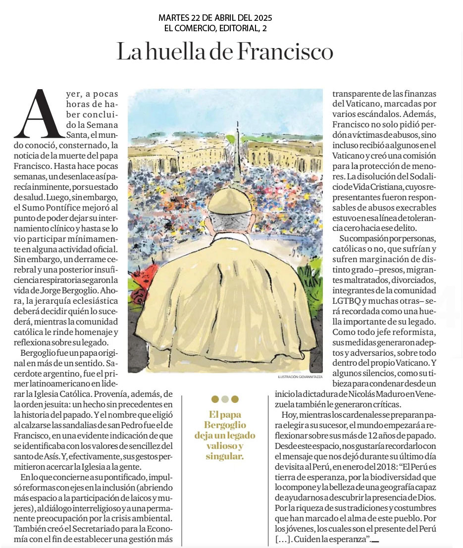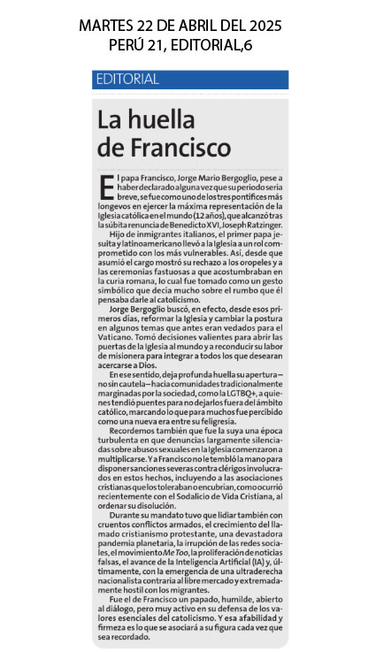 La huella de Francisco Ayer, a pocas horas de haber concluido la Semana Santa, el mundo conoció, consternado, la noticia de la muerte del papa Francisco. Hasta hace pocas semanas, un desenlace así parecía inminente, por su estado de salud. Luego, sin embargo, el Sumo Pontífice mejoró al punto de poder dejar su internamiento clínico y hasta se lo vio participar mínimamente en alguna actividad oficial. Sin embargo, un derrame cerebral y una posterior insuficiencia respiratoria segaron la vida de Jorge Bergoglio. Ahora, la jerarquía eclesiástica deberá decidir quién lo sucede, mientras la comunidad católica le rinde homenaje y reflexiona sobre su legado. Bergoglio fue un papa original en más de un sentido. Sacerdote argentino, fue el primer latinoamericano en liderar la Iglesia Católica. Provenía, además, de la orden jesuita: un hecho sin precedentes en la historia del papado. Y el nombre que eligió al calzarse las sandalias de san Pedro fue el de Francisco, en una evidente indicación de que se identificaba con los valores de sencillez del santo de Asís. Y, efectivamente, sus gestos permitieron acercar la Iglesia a la gente.