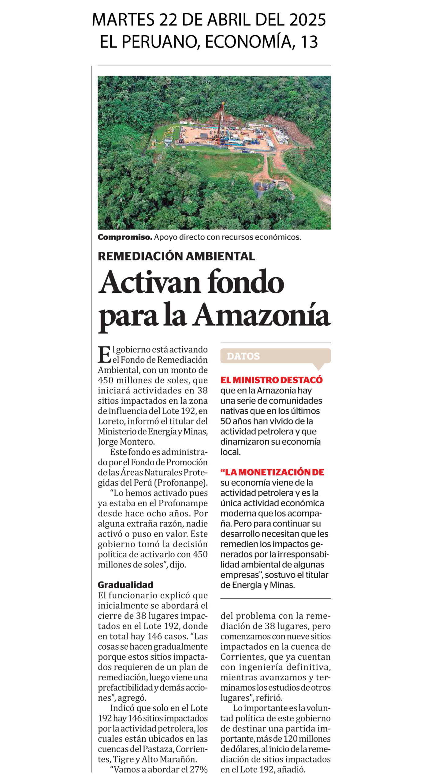 Activan fondo para la Amazonía El gobierno está activando el Fondo de Remediación Ambiental, con un monto de 450 millones de soles, que iniciará actividades en 38 sitios impactados en la zona de influencia del Lote 192, en Loreto, informó el titular del Ministerio de Energía y Minas, Jorge Montero. Este fondo es administrado por el Fondo de Promoción de las Áreas Naturales Protegidas del Perú (Profonanpe). “Lo hemos activado pues ya estaba en el Profonampe desde hace ocho años. Por alguna extraña razón, nadie activó o puso en valor. Este gobierno tomó la decisión política de activarlo con 450 millones de soles”, dijo. |