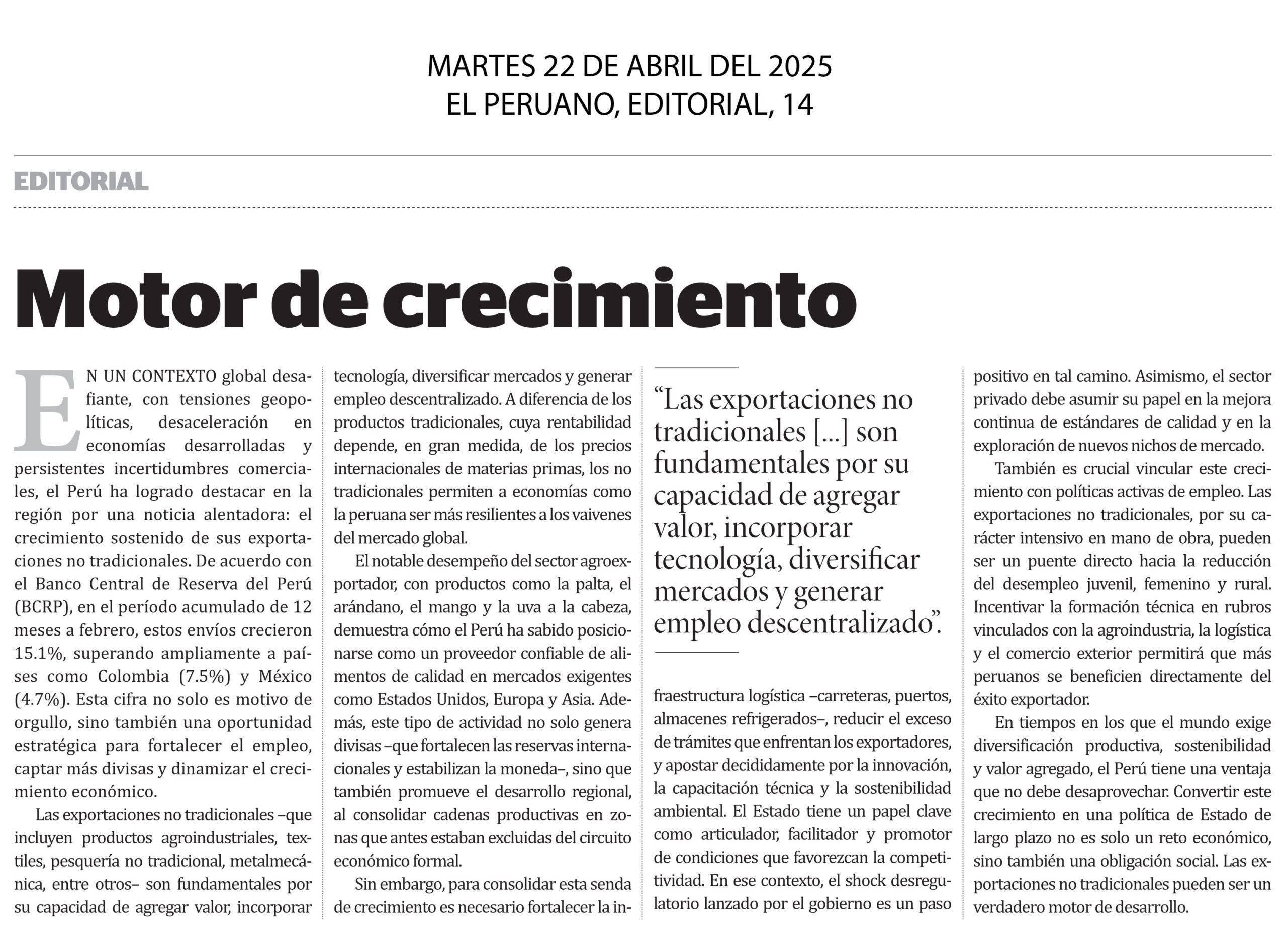 Motor de crecimiento En un contexto global desafiante, con tensiones geopolíticas, desaceleración en economías desarrolladas y persistentes incertidumbres comerciales, el Perú ha logrado destacar en la región por una noticia alentadora: el crecimiento sostenido de sus exportaciones no tradicionales. De acuerdo con el Banco Central de Reserva del Perú (BCRP), en el período acumulado de 12 meses a febrero, estos envíos crecieron 15.1%, superando ampliamente a países como Colombia (7.5%) y México (4.7%). Esta cifra no solo es motivo de orgullo, sino también una oportunidad estratégica para fortalecer el empleo, captar más divisas y dinamizar el crecimiento económico.