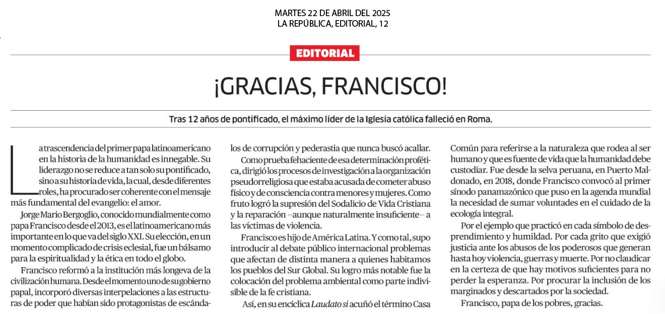¡Gracias, Francisco! La trascendencia del primer papa latinoamericano en la historia de la humanidad es innegable. Su liderazgo no se reduce a tan solo su pontificado, sino a su historia de vida, la cual, desde diferentes roles, ha procurado ser coherente con el mensaje más fundamental del evangelio: el amor. Jorge Mario Bergoglio, conocido mundialmente como papa Francisco desde el 2013, es el latinoamericano más importante en lo que va del siglo XXI. Su elección, en un momento complicado de crisis eclesial, fue un bálsamo para la espiritualidad y la ética en todo el globo. Francisco reformó a la institución más longeva de la civilización humana. Desde el momento uno de su gobierno papal, incorporó diversas interpelaciones a las estructuras de poder que habían sido protagonistas de escándalos de corrupción y pederastia que nunca buscó acallar. La República, Editorial, 12