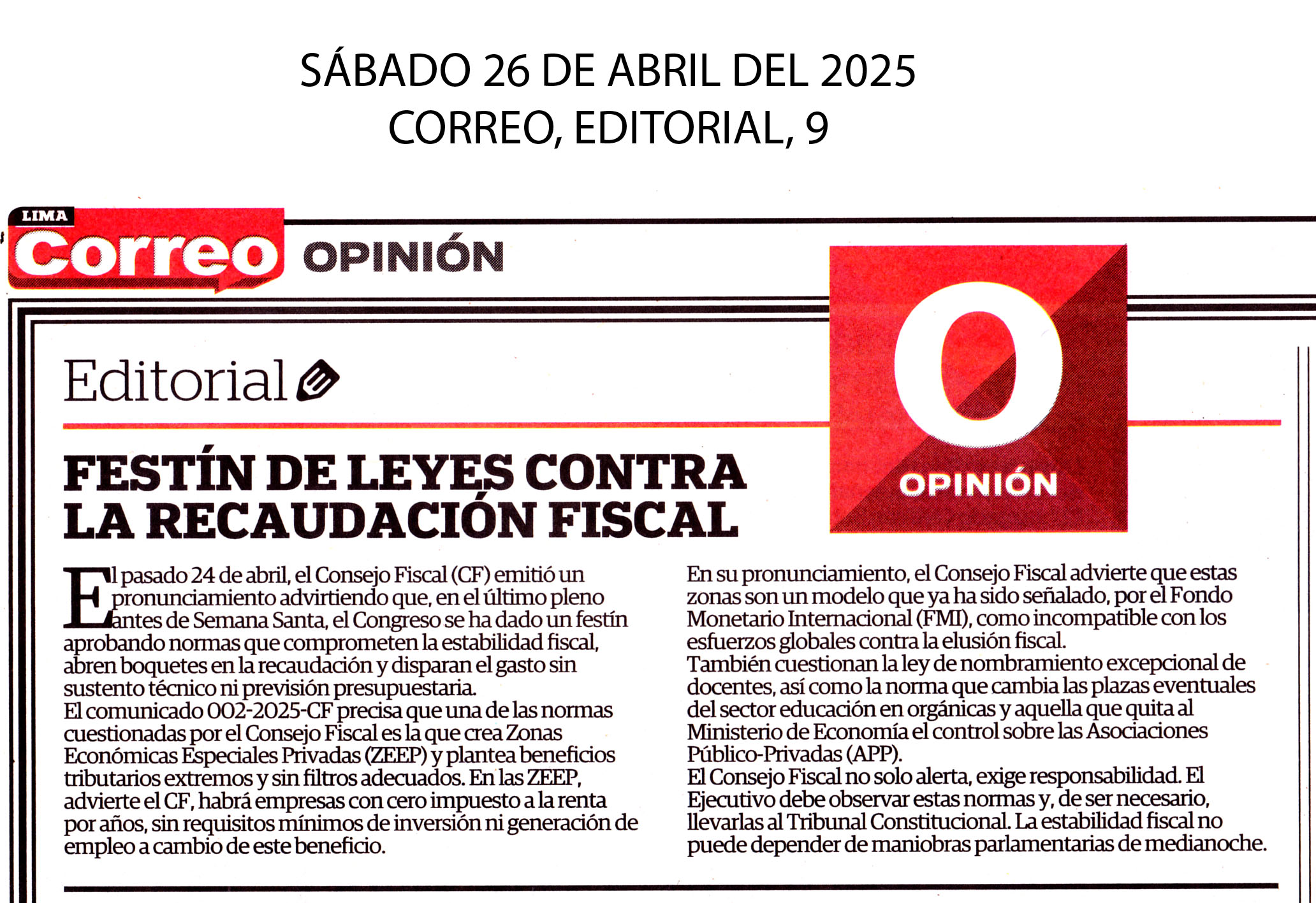 Festín de leyes contra la recaudación fiscal El 24 de abril, el Consejo Fiscal (CF) emitió un pronunciamiento advirtiendo que, en el último pleno antes de Semana Santa, el Congreso se ha dado un festín aprobando normas que comprometen la estabilidad fiscal, abren boquetes en la recaudación y disparan el gasto sin sustento técnico ni previsión presupuestaria. El comunicado 002-2025-CF precisa que una de las normas cuestionadas por el Consejo Fiscal es la que crea Zonas Económicas Especiales Privadas (ZEEP) y plantea beneficios tributarios extremos y sin filtros adecuados. En las ZEEP, advierte el CF, habrá empresas con cero impuesto a la renta por años, sin requisitos mínimos de inversión ni generación de empleo a cambio de este beneficio. En su pronunciamiento, el Consejo Fiscal advierte que estas zonas son un modelo que ya ha sido señalado, por el Fondo Monetario Internacional (FMI), como incompatible con los esfuerzos globales contra la elusión fiscal. También cuestionan la ley de nombramiento excepcional de docentes, así como la norma que cambia las plazas eventuales del sector educación en orgánicas y aquella que quita al Ministerio de Economía el control sobre las Asociaciones Público-Privadas (APP). Correo, Editorial, 9