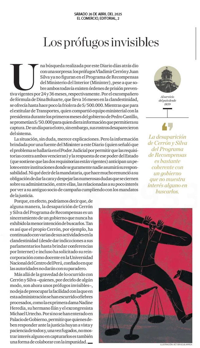 Los prófugos invisibles Una búsqueda realizada por este Diario días atrás dio con una sorpresa: los prófugos Vladimir Cerrón y Juan Silva ya no figuran en el Programa de Recompensas del Ministerio del Interior (Mininter), pese a que sobre ambos todavía existen órdenes de prisión preventiva vigentes por 24 y 36 meses, respectivamente. Por el excompañero de fórmula de Dina Boluarte, que lleva 16 meses en la clandestinidad, se ofrecía hasta hace poco la friolera de S/500.000. Mientras que para el extitular de Transportes, quien compartió equipo ministerial con la presidenta durante los primeros meses del gobierno de Pedro Castillo, se prometían S/50.000 para quien diera información que permitiera su captura. De un día para el otro, sin embargo, sus rostros desaparecieron del sistema.