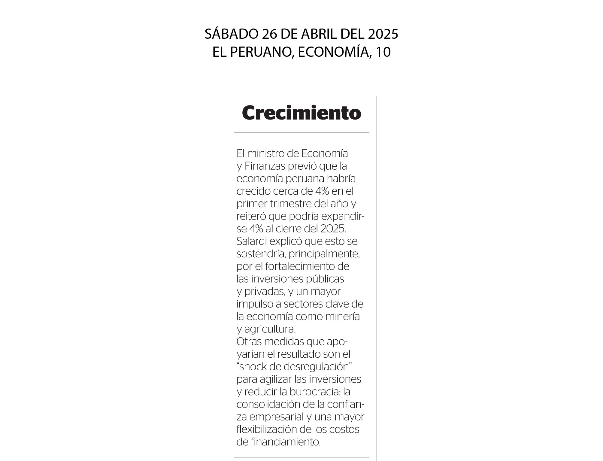 El ministro de Economía y Finanzas previó que la economía peruana habría crecido cerca de 4% en el primer trimestre del año y reiteró que podría expandirse 4% al cierre del 2025. Salardi explicó que esto se sostendría, principalmente, por el fortalecimiento de las inversiones públicas y privadas, y un mayor impulso a sectores clave de la economía como minería y agricultura. Otras medidas que apoyarían el resultado son el “shock de desregulación” para agilizar las inversiones y reducir la burocracia; la consolidación de la confianza empresarial y una mayor flexibilización de los costos de financiamiento.